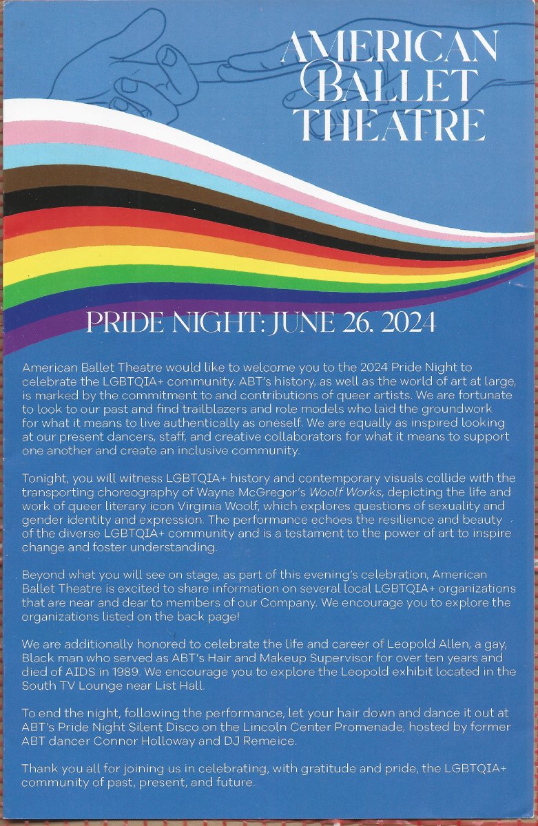 PRIDE in 2024 The current PRIDE movement was born from the tragic events of the AIDS epidemic. The Gay community, whose members had traditionally hidden a central part of their identities, could no longer hide behind the silence, which had protected them from the adverse effects of prejudice. The number of victims of the epidemic was so large and spread so broadly throughout the population, that society had to confront the prejudice which was based on sexual identities and practices. Healthcare, job and housing access - and many other vital aspects of life - had been denied to men and women on the basis of their sexual identities. Organizing and demanding health care - activities initiated during the AIDS crisis -- led to organizing for equality in many other aspects of life. The Gay community began to feel pride rather than shame in its identity. Bill Clinton had officially declared June as "Gay and Lesbian Pride Month" in a presidential proclamation in 1999. President Barack Obama expanded the official Pride Month recognition in 2011, including the whole of the LGBT community. Because this is primarily an article about dancers and choreography, I’ll leave others to expand on what the Gay Pride movement has achieved in the United States. Suffice it to say that I was inspired to write this article at this specific time, because I attended a performance by American Ballet Theatre on its fourth annual PRIDE NIGHT - this year on 26 June 2024. Presented as part of their Summer 2024 season in the Metropolitan Opera house, Lincoln Center, New York City, PRIDE NIGHT loudly proclaimed ABT's commitment to the principals of community, equality, diversity and inclusivity. ![]() Signing the Pride Flag, Photo: Bethany Beacham On the night I attended the ABT performance of WOOLF WORKS, the "Pride Flag" signed by ABT dancers, was brought on stage and held aloft by two ABT dancers, Devon Teuscher and James Whiteside, who were surrounded by the entire cast of Wayne McGregor's WOOLF WORKS after its PRIDE NIGHT evening length performance. ![]() 26 June 2024, photo labelled PEACE, LOVE & PRIDE This avant-garde production depicts the life and work of queer literary icon Virginia Woolf. Below is a high-resolution scan of page one of American Ballet Theatre's program insert. Enlarging the scan provides a large, readable copy of ABT's statement of commitment to the principals of PRIDE. ![]() ABT Pride Night, 26 June 2024, program insert, statement about ABT and PRIDE Silence allows hatred and prejudice to fester and triumph. ABT's post of its photos of PRIDE NIGHT proclaimed, "Peace, Love, and PRIDE " Though prejudice and hatred cannot be eradicated by proclamations and dance productions, the dance community's clear statement of support for those who manifest its art, no matter what the details of their private lives, has been a powerful force for inclusion, diversity, equity and accessibility. FOOTNOTES 1. Merce Cunningham (1919-2009) was a major creative force in modern dance in the 2nd half of the 20th century and the first decade of the 21st century. He created a distinct movement vocabulary and choreographed 190 repertory dances and more than 700 "Events". I quote from the Cunningham Trust's website, "[Merce's] seven-decade career was distinguished by constant innovation in which he expanded the frontiers of contemporary art, visual arts, performing arts and music." ![]() Trained in both classical Kathak dance (Pt. Birju Maharaj, beginning 1967) and Merce Cunningham modern dance technique (1971 to 1978), Janaki Patrik has choreographed thirty full-evening productions and numerous shorter works exploring an eclectic range of poetry, mythic storytelling and music. She is the Artistic Director and Founder (1978) of The Kathak Ensemble & Friends/CARAVAN, NYC. A dedicated teacher, Janaki has trained dancers to perform an extensive repertoire of classical Kathak, as well as her new choreography. Teaching and performing in inner-city schools through Urban Gateways / Chicago and Young Audiences / New York for forty years, Janaki has embodied the power of dance and music to communicate the interconnections of all cultures. Post your comments Please provide your name along with your comment. All appropriate comments posted with name & email id in the blog will also be featured in the site. |