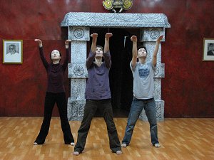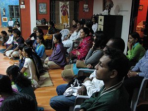 We were still quite on time for the informal interactive session arranged by our host Madhu Nataraj and Natya Institute of Kathak and Choreography, at 7.30pm at their premises. As luck would have it, something happened, that has never happened before in my frequent trips to Bangalore. A SUV bumped into our vehicle from behind and before we knew it, the driver of that vehicle grabbed our car keys from the ignition and refused to part with it, till we paid him compensation for the 'damage'! It all happened in a flash. So, it was Hindi, English and Tamil fighting against Kannada for half an hour while the 4 lane traffic continued to move around us. In between all this drama, we exchanged frantic phone calls (one is indebted to cell phones at such times!) and finally decided that Hari's group should go ahead and start the evening. The ever gracious Madhu, guru Mayaji and the dancers and other guests waited patiently till Hari and his group reached the Natya studio nearly 45 minutes late.