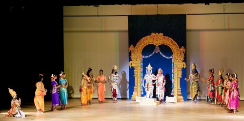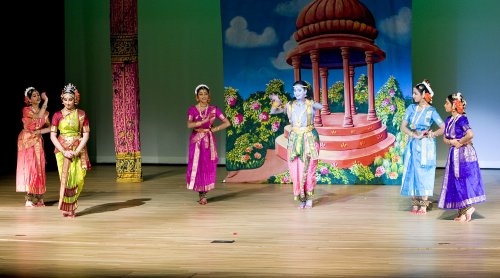 Lakshmi later transforms herself into a ‘gollabhama’ (cowherdess) and seeks to find her Lord with the help of Shiva and Brahma, who are now in the forms of a cow and calf. She approaches Chola Raja, who buys the cows and instructs his cowherd to take them to the royal cowshed. When the cowherd discovers that the cow is not yielding milk, he follows it and finds it emptying its udder over an anthill. Not realizing that the cow is nourishing the Lord himself, the cowherd hurls his stick at the cow. Vishnu steps out of the anthill to protect the cow and takes the blow on His forehead. The king kills the cowherd for hurting Vishnu, and Vishnu in turn curses the king for his harsh behavior. Vedantam Raghava as the Chola king was majestic. Mouna Yalamanchi as the sprightly gollabhama was charming in the sequence (Idi ento sadhuvaina), and young Sricharan Navuluri as the cowherd was pleasing, particularly in the sequence where the cowherd is upset with the cow (Aavu nee tassadeeya). The ‘dancing cows’ (Mouctika Paluri, Neha Bode, Mallika Gandhi and Shrutika Reddy) left younger members of the audience amused. The emergence of Vishnu from the anthill marks the beginning of the second half of the story. Wandering among the hills of the Chola kingdom, Vishnu visits the ashram of Vakuka Devi, who is deeply immersed in her worship of Krishna (Janmaantaramula gnyaapakamulu raa in Neelambari). Vishnu reminds her that in her previous life even though she was Yashoda, Krishna’s foster mother, she had not been fortunate to witness any of His weddings. He promises her that as Vakula, she will witness His wedding, as Srinivasa, to Lakshmi. Mouna Yalamanchi gave a convincing portrayal as Vakula, while little Suman Vadlamani played the young Krishna playing around in Vakula’s imagination. ![]() Disheartened by the sakhis’ behavior, Srinivasa goes back to Vakula’s ashram, where Narada advises him to become an ‘erukalasaani’ (soothsayer) and facilitate His own wedding with Padmavati. The ‘erukalasani’ visits Akasa Raja’s palace, where she convinces Padmavati’s parents, Akasa Raja (Vedantam Raghava) and Dharani Devi (Vaidehi Yellai) that Padmavati is destined to marry Srinivasa, who is none other Vishnu Himself come down to earth. The erukalasani’s visit is followed immediately by Vakula’s visit to the royal couple with a proposal from Srinivasa to wed Padmavati, and of course, they agree. Jyothi Chintalapudi excelled in the brief but important role of the erukalasani. The celebrations that follow the news of the impending wedding was depicted with a lively ‘suvvi’ dance (Pranhuti Suri, Bhaskari Burra, Bharathy Sunkara, Spruha Deval, Srirupa Banda and Rima Niyogi) which showed womenfolk engaged in wedding preparations such as pounding rice and turmeric and decorating the city. With a folksy touch and fast paced movements, this item was popular with the audience. ![]() |