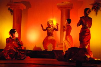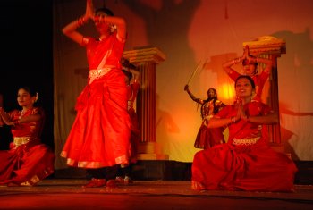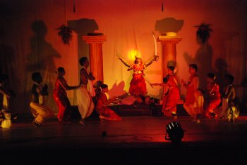 The story and concept as depicted in the performance and the message portrayed. Mahishasuramardini is an age-old drama depicting the victory of the good over the evil. The evil is no less powerful, in fact it is powerful than the Mightier, the gods. He is intelligent, brave and strong. All the gods come together and create a power "Shakti" which has the combination of all powers from all the gods together. This is manifested in the form of Durga. In the myth, with her charm and valour, she lures Mahisha and finally overpowers him. In today's time we have Mahishas in every aspect of life; with their intelligence and strength they rule our unsatiated hunger for power. In modern times, Mahisha uses this human weakness for his own good and becomes stronger and stronger. We feed Mahisha, we nurture Mahisha by constantly craving for his luring. We make him more and more powerful. The obsolete power turns him into a demon and he starts destroying everything in frenzy. This demon enters into the glass house of our dreams and destroys everything that we desire. We need goddess to destroy and control this demon, who will create the goddess "shakti" for us to quell the demon. We are no gods to create one nor do we have the power to overwhelm the demon. To defeat Mahisha we have to control the Mahisha by controlling our desire, by resisting the unsatiated hunger for more, by checking our dreams for their falsehood and sky rocketing ambitions. Mahisha is not out there, Mahisha is amongst us, we are the Mahishas. It