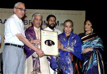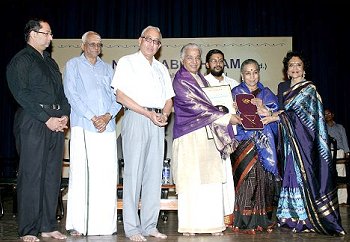 The evening started off with a half hour veena recital by Jayalakshmi Shekar. N Murali, President of the Music Academy and Managing Director of The Hindu, presided over the function and presented the award. In his presidential address he said that the Dhananjayans are a role model not only as a Bharatanatyam couple, but also a role model to lead a good, happy life. Vyjanthimala Bali complimented the Dhananjayans for their aesthetic and traditional approach and creative ability without deviating from the tradition. R Krishnaswamy, President of the City Sabhas, lauded the couple's contribution to art and way of life as a great source of inspiration to the younger generations. He commented that Dhananjayan's free and frank opinions did not even spare his Sabha with which the couple has been associated for nearly 40 years. In fact, Dhananjayan performed for Narada Gana Sabha in 1963 for its inauguration at Music Academy, when the sabha then did not have its own premises.