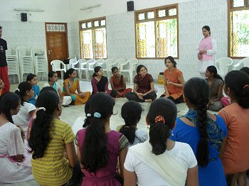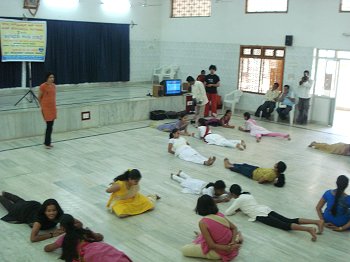 Chirantana did a commendable job by not only gathering the local press and district heads, but also mobilizing over fifty youngsters interested in dance. The day-long workshop was conducted by Madhu and her team of expert dancers from her Stem Dance Kampni. Stem stands for Space, Time, Energy and Movement, the four pillars on which the very art form of dance thrives. The dancers Janardhan Raj Urs, Ponamma Deviah, Suryanarayana Rao, Keerthi Kumar, Prathama and Sunaina are not only well-trained dancers at Natya Institute, but are also expert teachers and have traveled and performed all over the world as a Kampni repertory. The session opened with lighting the traditional lamp and a prayer. One Mr. Kulkarni was present at this occasion. His father was a well-known figure of his time, who not only patronized dance and other folk artists, but also conducted festivals time and again. His son came there specially to meet Dr. Maya Rao who told him to continue the good work his father was known for.