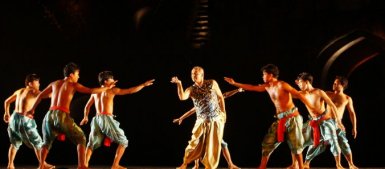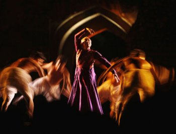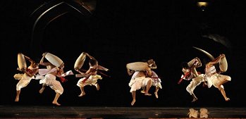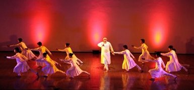 Rhythm Divine, Astad's choreography with the Manipuri Pung Cholam drummer dancers at the outdoor venue of Delhi's Purana Quila was part of the five-day Ananya Dance Festival, described as a dialogue between movement and monument. Astad is fond of site-specific work and his choreography here rose to the occasion before a packed audience of teeming humanity. In Rhythm Divine, Astad plays with "a seamless blend of the avant-garde with traditional movement" as noted in the introductory announcement. The show opens with a moving body inside a large amorphous plastic sheet on centre stage, a foetus inside a womb surrounded by kneeling bodies. The form emerges out of the plastic and Astad greets the audience with a low back-bend as if paying homage to the viewers and to the divine powers around us. The soulful sound of an operatic soprano intones profound feeling reflected in Astad's body. Throughout the first two segments, a dedicatory quality is pervasive, offering everything to a higher realm; qualities of reverence and spirituality that are part of the Pung Cholam tradition of Manipur. The segments flow with a perceptive choreographic logic from the slow and devotional to staccato beats and martial movements. Astad uses the bol cholum, the loud recitation of drum syllables and dance steps usually executed with visible drums but Astad's choice "to reference the drums" (Astad's comment during the Seminar organized by Ananya the day after the show) without showing them until the very last segment works evocatively. The invisible drums are beaten via gestures, with clapping, with palms beating the floor rhythmically. The audience, expecting to see the drums is held in suspense until the drums appear in the final segment. In one section the dancers play the khartals (cymbals) held by bright red cloth that etched beautifully in the stage lights. Astad's own entrances and exits into the group were both at times imperceptible as well as carefully marked with his buoyant and energetic interactions with the drum dancers, imitating their movements, then leading them with his, in a sawal-jawab (question-answer) type interaction. He also performed Kathak-style chakars (circles) with breathtaking speed and aplomb that had technical mastery along with ecstatic dancing evoking the Sufi tradition of whirling and evoking the divine. The choreography was punctuated by sounds of ritual gongs followed by silence, piercing gunshots reminding the audience of the ongoing violence in Manipur. However, the overall feel of the work is ritualistic and meditative. Similar to Astad's work with the Salaam Balaak street children, in Rhythm Divine, he creates with a differently marginalized group from Manipur in India's troubled Northeast region. Astad works as choreographer, dancer, and presenter for these groups. Although Astad's style is highly individual, he is gifted at interacting and collaborating with a variety of performing artists. He has also worked with thang-ta, Manipuri martial artists whose "agility and virility" could assimilate Astad's rigorous technique. During the Seminar, Astad demonstrated how a physical movement from martial arts flows into his own movement. He is very clear about how he works with different styles - it is never a matter of simply "adding on" but discovering connections between his own technique and other styles. And he brings new body awareness and choreographic insights from his own style for differently trained artists not used to taking crouching positions or dancing to unfamiliar music. Astad notes