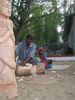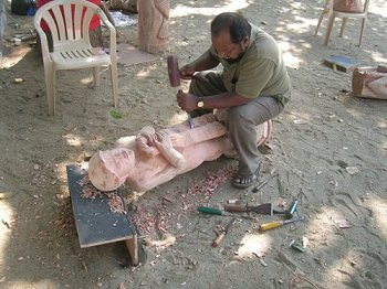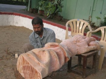 of RLV collage of Fine Arts, Thrippunithura, Kerala, carves the trunk of