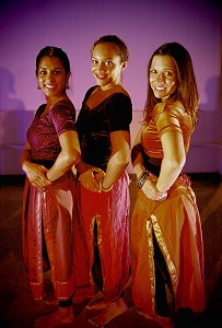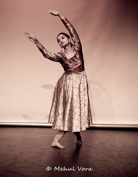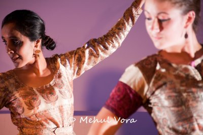 pedestrians, and Bollywood between them November 6, 2010 Celluloid E-Motions, choreographed by Pallabi Chakravorty and performed by her Kathak ensemble, Courtyard Dancers, is packed with silent commentary on how dance viewership has evolved with time. The piece begins in the Asian Arts Initiative's art gallery, bordered on one side by floor length windows facing Vine Street, and on two other sides by the exhibit "Of Filmi Love And Other Demons" featuring paintings, mixed-media, and photography of the omnipresent influence of Bollywood cinema in contemporary pop culture. Flanked between two pillars and separated from the audience by only a few feet, the intimate setting suggests the performance tradition of dancers in the royal courts of a past era. To further pay homage to Kathak's history and the iconic romantic image of the courtesan dancer, two short Bollywood clips are played for the audience - black and white classics filled with nostalgia and deep emotion. The video clips are interwoven with vibrant group choreography accompanied by poetry set to music ("ghazal"). Commendable performances in this area were given by Amelia Sinkin and Diditi Mitra, both of whom gracefully executed the distinctive pure dance features of Kathak: spoken syllables ("bols") and clapped out rhythms, rapid spins (known as "chakkars" or pirouettes on a flexed heel), phrases highlighting gaits and diagonals (referred to as "tukras"), and precise footwork demonstrating time-cycles and speed variations. At other times, facial expression dominates as a narrative is communicated by the dancers. A particularly interesting scene features Pallabi Chakravorty and Shibani Patnaik, a guest artist performing in the Odissi form of classical Indian dance. Each dancer uses her own classical form to improvise the use of a woman's veil, a concept known as "ghunghat" in Kathak. The soft, lingering, hand gestures and delicate emotions of longing and desire were well portrayed by both dancers. It also provided the audience with a rare opportunity to see a side-by-side contrast of these forms, notably, their common vocabulary and the different techniques and choreographic approaches. In another scene, classical Kathak is juxtaposed against the pumping beats of a Bollywood music score meshed with Bhangra and western HipHop, until it gives way to a filmi dance sequence. While filmi dance can often seem incongruous with larger works using classical movement, it was subtly done and representative of the "celluloid" movements and emotions of pop culture dance routines.