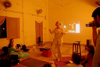 You wouldn't be the only one asking such a question. Janet Smith asked it, for example, and contemporary dance asked it of classical dance, and posits very different answers. What's more, contemporary dance, says Janet Smith, asks questions about, and prods people into investigating what it means to be alive today. (That's another reason to dance.) This is no abstract goal, and the goals are set higher than one might think. One definite item on the SDT's things-to-do list is to revive the city of Dundee (which city, by the by, said Janet Smith, has jute links with Calcutta): Janet Smith and the SDT will use art to revive their city of Dundee. This is an admirable goal, and we wish SDT every success. On a theoretical plane, however, is this the point to art, or specifically to dance? Must art/dance carry out social service to be considered valuable? On the other hand, if an art or its practice could be of substantial material service to society, would it be a lesser art? Are art and social service incompatible? Would it be art if it were entirely contained within itself, alienating audiences by an obsessive self-experimentation? For Janet Smith, how does the dancer do something very new, without at the same time alienating an uninitiated audience; how does one find the balance between audience and experimentation? Is it possible to direct the mind and attention of the audience: say, have them look at a performers feet, or the way a finger twitches? Of course, an audience's attention can be focussed by diverse stage devices like lighting, costume, blocking or even dialogue. The idea isn't so much as to plant an exact thought in the rasika's mind (I prefer this term to 'audience' or 'spectator' ever since our adda about the Natyashastra with Vandana Alase Hazra) as to stimulate any response. In dance, there is something for the dancer/performer and for the viewer/audience. Perhaps this is why the term 'rasika' is so attractive. It could mean both the performer and also the audience. Perhaps both the dancer as well as the viewer are the rasikas of a dance performance. In this sense also, dance is inclusive: it involves Janet Smith and you and me. Perhaps you,