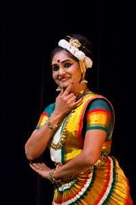 evening would be extraordinary. When the music begins and Sunanda glides onto the stage, her appearance takes my breath away. She emulates the fiery splendor of India’s culture, and the unparalleled graceful expression of devotion to God through the arts. If you take her costume on its own – with all its gold, silk and gemstone – it might seem ostentatious on a mere mortal. The magic begins when Sunanda invokes Lord Ganesha, remover of all obstacles, in the dance entitled Ananda Ganapathi. In this dance, she humbly asks for the Lord’s blessing for the success of this performance. The blessing sought is not only for herself but for her audience to feel exhilarated. The charm of her subtle eyebrow movements, the hallmark head wobble, her intricate hastas and graceful swaying of her body emulate the lasya of Ganesha’s mother Parvathi. Sunanda’s subtle eye movements turn to a fierce gaze as she moves to tie a tiger skin around her waist and take a majestic pose, and we recognize Shiva, Ganesha’s father. She then displays the wonder of a devotee witnessing the jubilant dance of Ganesha, and the spell has been cast. The audience has become the devotee, blessed by dance and music. The next item Sunanda presented was a composition of the Maharaja of Travancore, Swathi Tirunal’s “Chaliye Kunjan Mo.” Here, as the heroine inviting Lord Krishna to an arbor on the banks of the river Yamuna, Sunanda takes our hand and gently invites us to a world of lush and lyrical beauty. In her dance, she embodies the resplendent landscape of Kerala, the birthplace of Mohiniattam. With delicate and elongated red-tipped fingers, she gently reaches for Krishna’s irresistible yet elusive hand. If her gentle grasp could not persuade him, surely her magnetic gaze could. She shyly glances from her beloved to the arbor – “see how lovely it is there, come with me.” How can he resist such charm? If that is not enough to entice him, she then describes the allure of the river bank, the call of the cuckoo, and the scent of flowers in the cool breeze (which the bees cannot resist, so why should he?). She glides and dips across the stage, illustrating the boundless flow of devotion, as deep and powerful as Yamuna itself. The subtle abhinaya and the intricate nuances she brought out was a delight to watch. In “Oru Magal,” an