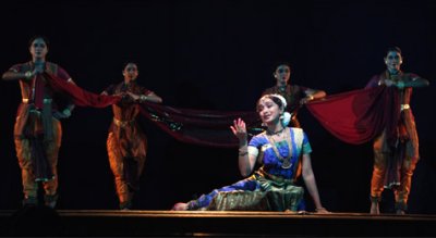 ‘Vasantha Prabhavam’ choreographed by Rajeswari Sainath, featured Vyshnavie Sainath, Krithika Shurajit and Manasvini Ramachandran, daughters of Rajeswari Sainath, Radhika Shurajit and Revathi Ramachandran respectively. The concept for this piece was by sakuhachi maestro John Kaisan Neptune and mridangam maestro Guru Karaikudi Mani. The movements were a celebration of nature’s beauty - the evocative hues of a sunrise, the dramatic tones of a falling dusk, the shimmer of rain on the leaves, the dance of the peacock, the race of a deer in the rain, the change from one season to next, from night to day, from planting of seeds to sprouting of new leaves to profusion of blooms in springtime. The item was performed to instrumental music. Vyshnavie was very supple like when she depicted the snake. The dancers were good, there were some new movements, but the music was too loud (not their fault!).
