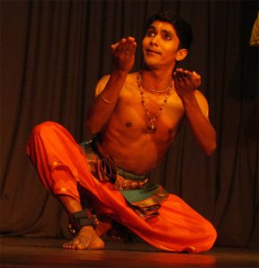 The performance of the evening featured 4 dancers who have been trained in Kalakshetra style – Renjith Babu, KB Madhusudanan, CG Ajeesh and KM Jayakrishnan. The announcer Krishna Kumar set the performance rolling by starting off the show as the dance teacher and the items progress to portray the full fledged dancer. The program started and ended with the group with 4 solos in between. The first item chatusra Alarippu was done in a combination of eye and neck, hand and leg movements of varying pace and positions. Jayakrishnan’s solo “ananda nadamidum padham” sung by OS Arun in ragam Kedaragowla was choreographed by Leela Samson. Madhusudanan’s solo “Jaganmohanane Krishna” sung by Hari Prasad in ragamalika was a Purandaradasa composition choreographed by Renjith Babu, whose own solo that followed depicted the raudra roopam of Shankara to remove the evils of the Kaliyuga. “Shankara rudra rupa diklao” was in Shankara ragam and adi talam, choreographed, composed and sung by Renjith’s guru CV Chandrasekhar. Ajeesh, a Muslim learning Bharatanatyam, presented the popular bhava laden Jayadeva ashtapadi “Priye Charusheele” sung soulfully by Hari Prasad in Mukhari ragam. The flat lighting throughout this piece did nothing to enhance the mood. The finale saw the 4 dancers present a brisk thillana like item titled Adhvay about the 10 types of gunas as specified in Nandikeswara’s Abhinaya Darpanam. It was choreographed by Madhusudanan and had earlier been staged for the IDA festival where it received rapturous applause. Seated on the left side of the stage, Krishna Kumar strung the presentation with his enchanting Tamil commentary and won over the audience! But the dancers themselves went through the motions in a mechanical fashion, looked tired and bereft of energy. Since they are mostly doing group work for corporate shows and in the productions of other dancers, they have rare opportunity to do solos and should have made use of this platform to shine. Even the group items showed lack of rehearsal.