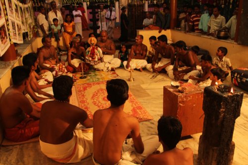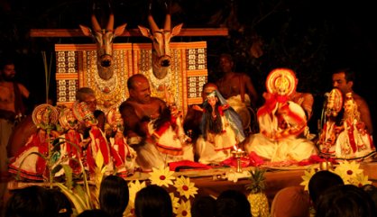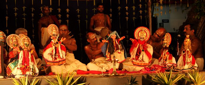 Opening with the ritual pooja or worship of the puppets at the residence of Chamu Pandaram with the auspicious sound of conch, chengila, edakka, elathalam et al at the Mariyamma Kshetram of Paruthippulli village, the festival was formally inaugurated by the senior most puppeteer of this traditional family, the 86 year old Karuppan Pandaram. There was also a workshop where Gurus like Ravi Gopalan Nair and K Sreenivasan trained the young talents prior to the evening performances of Kalyana Saugandhikam and Dakshayagam. The villagers dressed in their colourful garments poured in large numbers as if it were a festival of the sort. The same excitement continued throughout the weeklong festival at other venues comprising Kodumbu Gramam, Poomullimana, Kothara, Kullukkalloor, Kottakkal, Azhvancherimana, Tavanur and Irinjalakuda where it concluded at Natana Kairali. The Pavakathakali performances of Kalyana Saugandhikam, Dakshayagam and Duryodhanavadham during the festival were written and directed by G Venu and performed by puppeteers KV Ramakrishnan, KC Ramakrishnan, Ravi Gopalan Nair, K Srinivasan and Kalanilayam Haridas. Accompanying musicians were V Thankappan on chenda, Kalanilayam Unnikrishnan on edakka and Kalanilayam Ramakrishnan as the vocalist who enhanced the rasa-bhava of each and every dialogue with his melodious singing. Narayanakutti was the stage decorator who used the palm leaves to create wonderful flowers, intricate lattice patterns and the Torana- Bandhanwaars with his imaginative creativity.