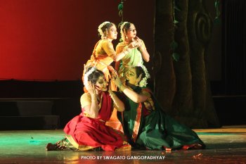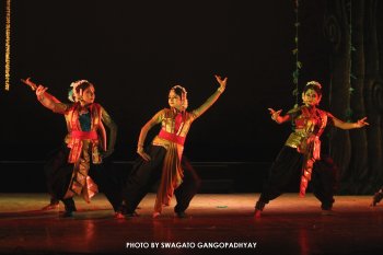 Paschime Rabi by Kalamandalam Kolkata - Nita Vidyarthi e-mail: drnitav@rediffmail.com Photos courtesy: Kalamandalam Kolkata July 25, 2013 Songs of Tagore based on Western melodies, Irish and Scottish tunes to be more specific, have been presented innumerable times with different permutations and combinations of their original versions but a choreographic presentation entitled Paschima Rabi (the Western Sun) on the theme by Guru Dr. Thankamani Kutty and Kalamandalam Kolkata at Rabindra Sadan as a part of Nikhl Banga Nababarsha Utsav Samity, is perhaps the first one. Somnath G. Kutty comes up always with interesting ideas and this one is no exception. Conceived and directed by him, the presentation incorporated western classical style of social dancing- ballroom dancing like The English Waltz ,Viennese Waltz, Foxtrot, and Latin American Salsa, Samba and contemporary styles side by side with Bharatanatyam and Kuchipudi for the Rabindrasangeet renditions. ![]() Opening with a group presentation in Bharatanatyam set to the song “Alo Aaamar Alo,” the dancers of Kalamandalam proved their training and team work dancing joyously with this ever popular melodious number. Often heard numbers in Scottish tunes like “Phuley phuley dhole dhole” and “Purano sei diner katha” adapted from “Ye Banks and Braes” and “Auld Lang Syne” respectively were also included. The Western classical dance numbers were by Pedro S Kundu (who has also directed the western numbers) and Rony Roy and the Bharatanatyam and Kuchipudi ones by senior dancer Malabika Sen. Malabika, known for her abhinaya and singing talents, was naturally convincing as a lovelorn nayika in “Aha, aaji e Basantey” based on the Irish number “Go where the glory waits Thee.” Senior dancers Malabika Sen, Jhinuk Mukherjee, Jalsa Chandra, Moumita Chatterjee, Soumita Ghosh, Jayita Ghosh, Ashesha Sahalina Basu, Tania Dewanji and Sejuti Sengupta participated.