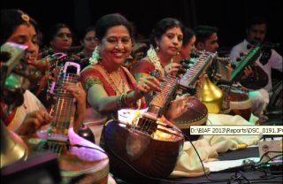 The final day of Bengaluru International Arts Festival 2013 took place at Chowdiah Memorial Hall. BIAF hosted the 50 Veena Ensemble ‘Naada Tarangini’ led by Dr. Suma Sudhindra. The veena artistes and percussion group led by Anoor Anantha Krishna Sharma began their mesmerizing recital with a varnam “Vanajakshi” in Kalyani ragam set to adi tala. A few songs selected by the team were “Mahaganapathim” in ragam Naattai set to eka tala, a composition of Muthuswami Dikshitar, apart from other compositions. 'Priya Tharangini' a composition by Suma Sudhindra was a highlight. A melody of 5 ragas ending with 'Priya' - Karaharapriya, Gayakapriya, Rathipathipriya, Bhakthapriya and Rasikapriya – was each in different talam. The tough and unique rhythmic structures were performed with impeccable coordination. Some of the renowned artistes who participated in Naada Tarangini were Anuradha Madhusudan, N Ramu, Tara Krishnamurthy and Srilatha. |