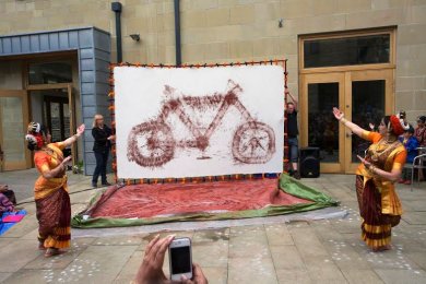 Bicycle with barefoot - Dr Nima Poovaya-Smith e-mail: umimistry@alchemyanew.com September 17, 2014 Kuchipudi is an ancient classical Indian dance form from the Southern state of Andhra Pradesh, known for its intricate footwork and subtlety of emoting through a range of facial expressions. The artistic director of Halifax-based Annapurna Dance, the irrepressible and imaginative Shantha Rao had conceived an unusual performance as part of the Tour de France Cultural Festival. Two Kuchipudi dancers would literalIy, through rhythmic dance movements sketch out an image of a bicycle onto a canvas placed over powdered paint. ![]() I wondered apprehensively, if this would end up being gimmicky. I could not have been more wrong. In the packed Viaduct Theatre at Dean Clough, Halifax, a charged atmosphere was being created through the burning of incense, the lighting of lamps and the hypnotic rhythms created by percussion instruments used for Carnatic music such as the ghatam and mridangam. Classical Indian dance, which has a close interrelationship with sculpture, is always a compelling visual spectacle and this one was especially so. The coral, gold and violet of the dancers’ costumes, their flowers and jewellery were arresting in their own right. Their dancing certainly delighted the audience and when they began to dance on the canvas, with remarkably precise footwork, excitement was at fever pitch. When the canvas was raised to reveal the powdery contours of a bicycle there was a unanimous gasp of wonderment from the audience. I wondered how the Peloton, a solid mass of muscle and bone, would react if these glittering, ethereal creatures had suddenly appeared before them as they pedalled furiously through Yorkshire. This performance seemed like an invocation, a direct appeal to the deities, for an auspicious Tour de France. Its particular power was derived from the fact that the dancers were actually referencing a rare aspect of Kuchipudi, called the simhanandini, where the outline of a lion (simha) is traced by the dancers as a plea to the Mother Goddess to conquer the forces of evil and illuminate darkness. However, the performance, consciously or unconsciously, also taps into other Indian visual traditions. The rangoli or floor painting is a domestic art practised all over India. Geometric patterns drawn from sacred symbology, as well as stylised images from the Hindu pantheon of gods, are created using a variety of media from rice flour to coloured sand to rose petals. Usually traced at the entrance to a house, they are meant to be sacred welcoming spaces for the gods. The bicycle created in front of our eyes certainly fitted into the tradition of the ‘painted prayer’ as rangolis have been described. Another visual vocabulary seemingly being referenced is a very local one. The village of Kuchipudi, where it is popularly believed this dance form originates, is situated near the historic towns of Machilipatnam and Kalahasti, famed for their kalamkaris. These are dye-painted cloths, where a pen-like tool (the kalam) is used to draw figurative, vegetal and abstract outlines on the cloth. I would not be surprised if the simhanandinis were not influenced by this neighbouring tradition, since there is a close resemblance between the kalamkari lion and the Kuchipudi lion. The dancers were Abhinandana MK, Kopal Vedam and Sarvani Yadavalli. The musicians were Bangalore Prakash (mridangam), Kamal Bir Sing (violin), Ramya Tangirala (vocals), with narration by Navya Rattehalli. Shantha Rao has managed to compress the ancient and the sacred, dance and the visual arts, and present it in a manner that makes it utterly relevant to a 21st century Yorkshire revelling in the fact that it had hosted the Grand Depart for one of Europe’s most iconic sporting events. ‘Bicycle with Barefoot’ was part of the Yorkshire Festival 2014 programme. Yorkshire Festival 2014 is the first Cultural Festival to accompany a Tour de France in its 111 year history. Dr. Nima Poovaya-Smith is Director, Alchemy in Leeds. |