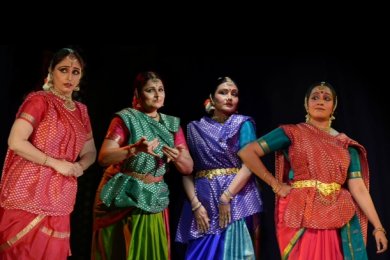 A ninda stuti penned by D.S. Srivatsa “Moodu kaanula vadito prema yenduko?” brought out an effective hasya rasa, performed by Sathyanarayana Raju. The choreography was as creative as the lyrics were. Kirata and Arjuna’s war over who shot a wild boar first, and Arjuna losing a long fought battle, and realizing that he has lost to none other than lord Shiva himself, bowing down to him and receiving the pashupatastra set the backdrop for the veera rasa. The vikaaara and vairaagya elements of lord Shiva were meant to communicate the bhibatsa rasa. Surya's performance was energetic and convincing. Vairagya comes from Shiva being Mrityunjaya or the conqueror of death. Bhibatsa is evoked on seeing the ease with which he wears the chitabhasma. The justification of why the attributes of Shiva evoke bhibatsa rasa was missing leading to a very weak expression of bhibatsa. Sathyanarayana Raju’s composition of Shiva being the holder of contrasting elements such as agni, apa and soma were short of effective in depicting adbhuta rasa. Surya Rao by choosing to essay the role of Bhasmasura, completely missed the point of bhayanaka. Shiva’s fear shown at least once during the chase would have added to the impact of the rasa. The rasa it portrayed was Bhasmasura’s veera, with his energetic enactment of the asura. The rasa it evoked in the audience was one of awe and laughter at Bhasmasura’s chasing Shiva. Shantha rasa by Pavithra Bhat was convincing as was his impeccable angika. The performance ended with a tillana in Sumanasaranjini by the young dancers who opened the performance. The delicate and challenging point of creating a Navarasa piece is to decide at the onset whether the dancer will portray a bhava and evoke rasa as in nritya, or the dancer plays the protagonist and experiences the rasa that transmits into the audience as in natya. Few of the rasas were executed as nritya and few as natya, maybe because of different styles of dance that the dancers adopted to portray the rasas. The second day’s performance began with a solemn note. After Usha had spoken of Mandolin Srinivas and her long standing professional relationship with him, a minute’s silence was observed in honour of his memory. The day’s presentation began with a pushpanjali by the young dancers brigade. The Nayika presentation began with “Varijamukhi...” in raga Kamas set to rupaka talam. Uma Sathyanarayanan’s performance was neat. Her presentation of the khandita nayika was powerful as it ought to be. “Arivenaiyya un antharangam ...” in raga Atana set to tala rupakam a composition of Dharmapuri Subbarayar was an apt choice. The choice of “Samayamide ra ra...” in the raga Behag to rupaka tala made one sit up and watch how it was going to take shape as a depiction of the vasakasajja as its sthyai. The opening itself created a prosutapatika nayika feel, diluting the sthayi at the outset. Although Poornima Ashok’s creativity and ingenuity in the choice of a piece was accepted into the framework of the presentation, except for few glimpses of the nayika decking herself with the jewellery given by her patron, and a brief decoration of a lover's bed there were no emphatic elements of a vasakasajja. Her spinning all the sancharis she did with a parakeya nayaka around their respective aharyas would have created more impact. Her depiction of the proshitabratuka nayika was convincing. The choice of “Ninnu chooda galgane innaluku....” (raga Punnagawarali, tala tisra triputa) with the nayaka being present and the nayika addressing him directly was a rare choice, as was the choice of raga for the piece. ![]() Soundarya Srivatsa, Subhashini Vasanth, Poornima Ashok, Uma Sathyanarayanan Soundarya Srivatsa easily stood out with her playing the swadeenapathika nayika supported by the song “Smarasundaranguni...” in raga Paras and adi talam. The piece started with a brisk pace and seemed well rehearsed and thought out. This was not the case with the kalahantarita nayika in the song “Netru varen enru....” (raga Pantuvarali, tala mishra chapu). The line “Aatrum karaidanile, andhi pozhudinile....” the dancer depicted taking a bath, when “andhi pozhudinile” clearly means evening. A more convincing depiction would have been showing the birds coming home, a sunset, when all the girls have filled their water pots and left for home. Then saying ‘he came to me when no one was there or looking’ would have flowed well. Speaking of artistic liberties on the other hand, who says one cannot bathe in the evenings? Subhashini Vasanth took on the virahotkantita nayika, with the all familiar kriti “Sakhi Prana...” in raga Jenjuti, adi talam. She held the sthayi well through the presentation. Her “Yarukkagilum bhayama” in raga Begada set to misra chapu talam flowed rather typically till the line “rajangamagilum....” It was interpreted as the nayika saying, “I am now royalty because I am the chosen one” as opposed to what is often depicted as “If I were royalty would people talk about me thus?” ![]() Standing: Yogesh, Nikitha, Arun, Anju, Aditi First row: Pruthvi, Chaitra and Gowri The performance ended with the same tillana as the first day. The presentation had the outstanding vocal support of D.S. Srivatsa and Vasudha Balakrishna. They were ably supported on nattuvangam by Shakuntala Prabhath, on the mridangam by Balakrishna, on the flute by Raghunandan and Shubha Santosh on the veena. The two day festival took place at the Bangalore Gayana Samaja on the 18th and 19th of September 2014. Usha Rk has to be lauded for her effort in conceiving ideas that provoke a younger generation of artists to explore genres such as padams and javalis, which are complex and challenging. She brought together artists from different parts of the country, different styles and gurus. As enjoyable as it was, it also raised several pertinent questions in the minds of thinking dancers, as it ought to have. Poornima Gur