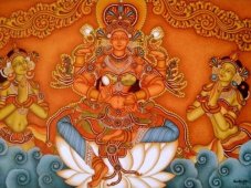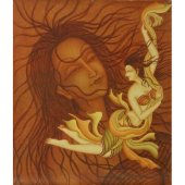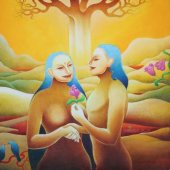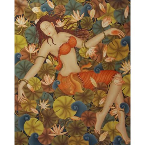 Thematically and stylistically she has a new approach. The paintings of the dragonflies dancing in the sky, the nymph of the deep sea, the swans poised as if in dance, are beauties that evoke an ethereal sense, far from the madding life. You just wonder whether they are the personifications of nature or the divine in themselves. In flowing lines, in subdued colours, Bindulekha transcends traditional murals to project the subliminal. Her dreamy figurines reminiscent of Ajantha paintings has continuity in the Indian art. The compositions implicate a decorative scheme offering a symbiosis of relationships between the beings in nature whether they are insects, birds or plants that foreground the figurative. There is range and diversity expressed through an individuated visual language close to rhythmic chant. The figurative idiom is linearly articulated in softly modulated colours. Without any pretentions to intellectual content her dancing figures, like insubstantial dreams, are joys forever. The latest, a face turned unto infinity, cast in shades of blue, within the halo of hair whereon translucent dragonflies flutter, evokes the presence of the sacred. Either male or female, an archetypal image of an iconic head, it stirs up the Buddha in the contemplative mood. Yet the distant look with a smile liltingly playing on the lips casts in a different light. Done for her husband’s venture, an art film, her painting connotes the theme and spirit of the movie. Bindulekha is a young artist and has a long way to go. Her uniqueness lies in projecting the subliminal, perhaps something exclusively feminine, hence the magic that lures. The exhibitions are remarkable for their aesthetics of communication, for the simplicity of visual language, and hence the simple audience that crowded the venue. Padma Jayaraj is a freelance writer on the arts and travel. She is a regular contributor to www.narthaki.com |