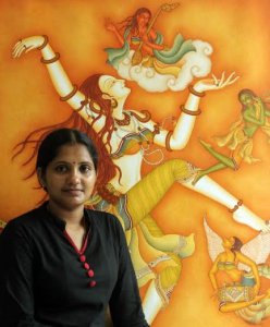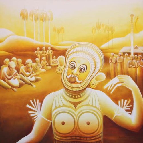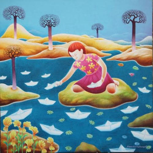 Nirveshtitham by Sivadas showcased the theme of masks in life. Masks are ancient in their origin all over the world. They have been in use as playthings for children, for arts and crafts, and still is part of mystical religions handed down by ancient cultures. Curated as a liner narrative, the artist presents the story of the Mask through human history. Even today, children enjoy them as toys. Mask is part of ritual performances like the Teyyam, Thira, Padayani etc., in Kerala. Masks are used to scare the crows by farmers and to take away the evil eye by almost all. It is used to impersonate characters in dramas. All these are the positive features. However, Nirveshtitham, a Sanskrit word meaning the naked, points to a deeper attribute of the mask as seen in human relations highlighting its negative facet. The unseen mask that we wear today to hide our identity in personal, social and political life is the theme of the exhibition. The artist shares his angst with the viewers wondering whether a life without mask is possible today. The technique of contrasts powers his masquerade in human relationships. The painting of the couple with a thin veil of mask, against the background of two flowers and two birds, is replete with irony. Even in intimate relation, human beings, unlike other beings in nature cannot exist without the mask. This has become a universal phenomenon today where diplomacy is mistaken for duplicity, is the stern comment of the artist. Friendships are filtered through the mask. Interspersed with paintings of nature and other beings in their naked glory, the mask in human life acquires a sardonic shade. Yes, we heave a sigh of relief to find an assembly of humans in meditation where masks are absent. Face to face with the ultimate reality the mask falls off. Acrylic on canvas, the paintings in bright colours tinged with luminosity are pleasing to the eye as we traverse from hell to hope. The tonal quality has its aesthetical appeal, even when the theme is harsh reality. Trained as a sculptor from RLV College, Thripunithira, Kerala, Sivadas is doing his part as art-director for documentaries and short films. He is a fine human being committed to the cause of children. He is instrumental to an ongoing program with the concept of ‘one world for children’, wherein artists and humanists are roped in to chart the plans. View Slide show ‘The Voyage of Dreams’ by Kalamandalam Bindulekha in another hall is the display of the other side of the coin. Trained as a dancer in Kalamandalam, Bindulekha is a self-taught painter. Inspired by her mentor Sadanandan, a mural artist, she began in the traditional format. The exhibition showcases her oeuvre. The paintings of Krishna and Devi are representations of temple murals. Maybe prompted by an inner urge she deviated from tradition because of her passion for dance. The figurines in fluid forms poised in dance karanas became her unique signature. Then came a period of bold experiment. Her dreams took wings. Viewers are charmed by their own dreams as the artist gave forms to their intangible fancies. She has come out of the intricate style of the murals, both in figuration and composition. ![]() Bindulekha