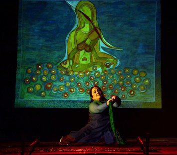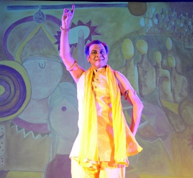 All that comes to an average reader’s mind is the ‘Sati’ image of a blindfolded woman as Gandhari. In the enormity of the intensity of her sensitive being within and the value of nonverbal suggestion an art work makes, Gandhari is outstanding among Ruby’s character portrayals. The dark red strip of the blindfold across her visage and the face of the invisible being (made visible) inclined to her left and the navel, to which the umbilical cord of each child was connected, give an idea of her tearing emotions. She is made of such stuff that her sensitivity encompasses not only her husband’s pain and the death of her hundred sons, but also the loss of values in the Draupadi episode. Theatre needs contextual narrative details to bring home to the viewer the intensity of the feeling depicted, and music and lights generally to enhance its effect. The circles with the suggestion of life within get turned into brightly lit tiny bulbs (Lights: Abhishek) in the performance and, tuned to the somber strains on the violin, Gandhari’s indescribable pain gets subtly conveyed in slow motion. Under the blindfold, Ishira as Gandhari recalls to mind the momentous unfortunate circumstances that gave an unalterable turn to the fate of her family and clan - and the people of this land for all the time to come. ![]() Krishna