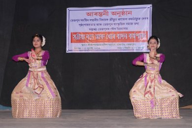 The workshop was held from 11th July to 21st July. The inaugural program was held at Sri Sri Sankar Mandir of Majgaon of Tezpur. The meeting was presided by most respected satradhikar of Sri Sri Nikamul Satra, Sri Punyabrat Goswami and the chief guest was Narayan Mahanta, DCF, Sonitpur. A special act of Mati Akhora was presented by Dibyajyoti Deka, a student of Rupkonwar Sangeet Mahavidyalaya and eye catching Sattriya was presented by Meghmallika Borah and Swati Bayan, students of Saptaswa. Also, the group of Pinkumoni presented an interesting item called Dihanaam, a special folk song of Assam. To conduct the workshop, special resource persons were invited - Sailen Saikia, retired teacher of Luit Konwar Rudra Barua State College of Music, who is trying to establish Sattriya on an international level along with his better half Sabita Saikia and their organisation Jugalbandi; Prabhakar Goswami, reputed Sattriya exponent of Assam; Nilamani Bora from Jorhat; Atul Bhuyan of Aauniati Satra; Krishna Jadumano Saikia from North Kamalabari Satra. Every day, the morning session took place from 9am to 2pm and from 5.30pm the Khol playing training was conducted. Girls also participated in the Khol playing training which is a positive sign for the growth of the art. The closing ceremony was held on 21st July in the premises of Komarchuburi Namghar of Tezpur where the resources persons were also felicitated. The program started with a Borgeet sung by Ankurmoni Sarma. After 10 days of workshop training, the participants presented an enthusiastic and impressive one act of Gayan-Bayan. At the same time, eminent Guru Sailen Saikia regrets that “in the present days there are some teachers who are misguiding our growing generation.” MLA Rajen Borthekur added that, “Nowadays our children are more interested in modern songs and dances but only our own culture and ethnicity will live on and will strengthen our society.” ![]() Felicitation From this workshop, out of 230 trainees, 16 candidates will be selected for special training under Guru Jatin Goswami. After that, they will be further trained in Sattriya dance at Majuli. |