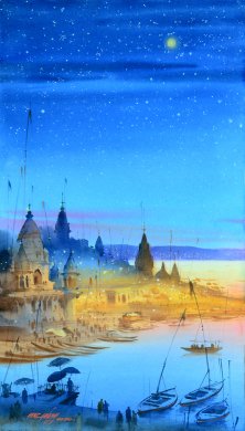 The sunlit river as the day dawns lights up the features of a visible, work-a- day world. Glowing sky lights up the waters. Birds dot the sky and humans dot the banks. Structures cast under shadows, has the quality of the mystique. Warm light spreads, pale golden hue emanates from the waters, another face of the Ganga. The offering lamps carry flowers with a flaming diya, light: hopes and prayers from throbbing hearts. They are afloat in the foreground as empty boats are moored on the backdrop suggestive of human activity and mobility with no humans around .The poetics of the Ganga carries the story of civilization built on its banks: from fishing to trade, from travel to voyages beyond. ![]() Here is another painting. Masterly treatment of the elements, water and light, under starlit deep blue sky has a magical quality. The landscape jutting into the waters glows in golden sunlight. The blue waters in the foreground, the gleaming white beyond the tapering stretch of land, a star spangled night sky with a moon suggestive of infinity: improbabilities, articulate a natural scene by sheer stretch of imagination. Fantasy or magical realism, call it what you like….you feel your spirit uplifted! Enchantment lies here and that precisely is the function of art. From this cornucopia the motifs of the artist rise, fall into kaleidoscopic designs from different perspectives, in different combinations, in varied scales, in limitless permutations and combinations intoxicating ancient impulses. You partake in Ganga lahari... in an epiphany the vision is born giving you the sense of direction, the mission in your life. The Ganga in her purity is your soul…Sullied by murky materialism, we have darkened our soul. The yearning to be pure again, to be home again, is the ache of the soul. Oh, what have we done to her!! In the name of rituals, in the name of industrialization, in greed for more and more, we have destroyed her. It is time to stop. Time to take stock. Time to think. It is time to clean up. Channelize all the energies. Divine Mother beacons. For the humans, the vision bequeaths a mission, that we are at the cross-roads. That the river, whether the Ganga, the Nile, or the Amazon has the potential of fury within. It is your choice. Choose in wisdom says Beauty. Says Art. May Ganga Matha open your eyes. You wake up to reality. Ganesh Hire is a practicing artist in different mediums, a winner of many awards and is currently working as a lecturer at L.S. Raheja School of Arts, Mumbai. Padma Jayaraj is a freelance writer on the arts. She is a regular contributor to www.narthaki.com |