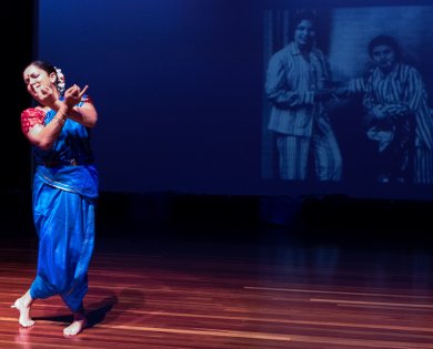 Becoming M.S. Subbulakshmi: A bold move in revealing our true history - Nithya Iyer e-mail: msnithyaiyer@gmail.com Photo: Arun Munoz Photography, Melbourne June 27, 2016 On a wintry Saturday night in Melbourne the regulars of the Melbourne Carnatic music scene gathered to celebrate the illustrious career of Carnatic vocalist M.S. Subbulakshmi with talented local exponents of classical vocal, violin and veena. Including performances from a range of professional and emerging artists the event saw the regular turnout of Australian South Indians keen to immerse themselves in the arts from their home and childhood. But amidst the silk saris and traditional Carnatic songs there was a new addition, and an unexpected one at that. After a 20 year international journey from professional South Asian dancer of Bharatam Dance Company fame (founded by Dr. Chandrabhanu) to academic, performer, choreographer, professor and author, Dr. Priya Srinivasan has returned to the Melbourne stage to celebrate and challenge the status quo of classical South Asian arts with her latest work Becoming M.S. Subbulakshmi. Part storytelling, part dance, and part video projection, Becoming M.S. Subbulakshmi is a multidisciplinary work that bridges archival research, narrative storytelling, Bharatanatyam and importantly, socio-political commentary. ![]() Commencing with the sound of the sruti, a short photo-documentary commences, painting an endearing portrait of the young M.S.S. through pivotal points in her youth, marriage and early career. The audience is hushed, many of them deeply connected with the music and persona of the Tamilian songstress. As the projections slows, the lights dim, and the voice of M.S.S. rises from the speakers. A spotlight upon the stage illuminates a figure clad in a blue silk sari to the audience. Sitting cross-legged, her hand rises encircling the air and her body sways as the raga alapana ladders to greater and greater magnitude; the intoxication one only knows from witnessing the blissful expression of a Carnatic singer deep in melody. From this place of intimate embodiment, Srinivasan gently guides us through the story of M.S.S. in first person. Crafted with the gestural finesse of Bharatanatyam and interspersed with questions, and generous and fluent helpings of Tamil colloquialisms, the audience is taken on a visual, kinesthetic, and auditory time warp. Srinivasan charts the early life of the songstress, and tells us of her struggles, her victories and her connection to the divine. But importantly, she tells us of the tribulations experienced by M.S.S. in growing up as a child of a Devadasi, a single mother, in a world dominated by Brahmin men - a side of this story that is rarely told. The work thus illustrates the life of M.S.S. in a way that has been hidden to most people. Against the backdrop of a black and white photograph of M.S.S. smoking a cigarette in her pyjamas, we are told the stories of her rebellious streak, her adventurous spirit, and of her stubborn desire to live the life that she pleased regardless of the limiting social norms of the time. In this way, Becoming M.S. Subbulakshmi baptizes M.S.S. into her rightful place as a feminist pioneer and socio-political trailblazer. It seeks to shift the context and understanding of M.S.S. in history by illuminating not only her personified characteristics, but also by directly acknowledging the social limitations and prejudices that she faced growing up in India, many of which persist in contemporary India and in diasporic communities today. Becoming M.S. Subbulakshmi is part of a larger exploration into performed storytelling by Srinivasan, who is back on the scene in Melbourne to empower emerging artists of a new generation. But importantly, a work such as this also evoked deep and poignant responses from the older generations of South Asians in the audience, men and women alike, who had grown up alongside the radios and film screens full of M.S.S as they endured the experiences of their generation. Srinivasan notes that it is her aim to bring the invisible stories of poor women to the light using a medium that combines performance, research, and the body. This quality is clear in her work and an exciting space to perceive. Becoming M.S. Subbulakshmi is a welcome dose of performative boldness, creative finesse and innovation in bringing new life to a South Asian history that remains to be told in its fullness. I dare say, watch this space. Nithya Iyer is a Melbourne based writer and performing artist engaged in the exploration of classical, contemporary, and cross-disciplinary performing arts and culture. She is the Chair of the Jambudvipa Association for Indian Arts, established by Dr. Chandrabhanu, with whom she has trained in Bharatanatyam since 2006. Nithya is the founder of cross-disciplinary practice BON. |