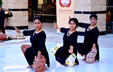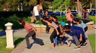 September 3 began with a focus on the city, enlivened by a performance called “Walking in Orange” (Irvine is located in Orange County), at 6pm performed in the Bill Barber Park adjoining Irvine City Hall. This site-specific work, choreographed by Priya Srinivasan and Susan Rose (Professor Emerita of Choreography, UC Riverside) brought together dancers from different dance and music backgrounds from Irvine Valley College’s Dance Program facilitated by Kathryn Milostan Egus, and Ramya Harishankar’s Arpana Dance Company’s Bharatanatyam students. They walked in pairs, growing to threes and fours, exploring the idea of mobility in a car-focused city. They walked together and individually expressing their movement styles as varied as freestyle hip-hop, belly dancing, jazz dance, Kathak and Bharatanatyam. The dancers also spoke about their connection to the city, its diversity, and the challenges faced at times by people of color who may feel exoticized and marginalized. The live soundscape was totally engaging and unique provided by Orange county resident Mayuri Vasan, a trained Carnatic music vocalist who melodiously rendered raga alapanas, accompanied on the violin by Kiran Athreya of Irvine, and Arun Ramabathiram from Los Angeles, on electric guitar. This was perhaps the first time that such a dance/music “happening” took place in Irvine! The multi-layered work was inspired by choreographer Priya Srinivasan’s global experiences as an artist who grew up in Australia, and who has lived in the US, in China, in the Netherlands and has performed in galleries, universities and museums in Holland, Germany among other European cities along with Priya’s use of spoken word with dance as part of her “talking dance” format for presentations. After “Walking in Orange”, the performers led the audience to the Irvine City Hall Plaza where two outdoor performances entitled, “Bharatanatyam Reimagined” by Ramya Harishankar’s students unfolded beautifully outdoors in the twilight hour. As the program notes state: “Living in Irvine, we are contemporary artists performing classical forms but how do we enable audiences to see and understand us without exoticizing?” Three dancers performed Anusha Kedhar’s (Ramya’s senior student) beautifully choreographed ‘Alarippu’ followed by an energetic and striking choreography by Ahila Gulasekaram (another one of Ramya's senior students), performed by eight Bharatanatyam trained dancers in pastel colored flowing tops and loose salwars. Live music by Ravindra Deo on tabla, oboe /vocals by Rohan and vocals by Visalini and her two sisters. Christopher Garcia, a multi-faceted percussionist, added an eclectic array of musical instruments from Mexico, India, and other places creating an imaginative array of sounds along with the movement.