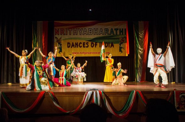 Nrityabharathi has been conceptualized by Dr. Saraswathi Rajathesh, Kuchipudi exponent and a doctor by profession who heads the Natyasaraswathi Kuchipudi Dance Centre in Bangalore. The motive of this festival is to provide a platform to young dancers in other cities and countries, hence it is known as the traveling dance festival. It is creditable to bring classical dancers from different disciplines performing together in the patriotic composition 'Vande Mataram' written by Bankim Chandra Chatterjee with suitable music composed by Bangalore's Praveen D Rao. Although the styles, technique and presentation seemed little different, the spirit of Unity in Diversity for which India is known worldwide, came to the fore. The classical dance styles performed were Bharatanatyam, Kuchipudi, Kathakali, Mohiniattam, Manipuri, Kathak, Sattriya and Chhau.