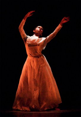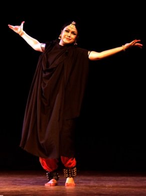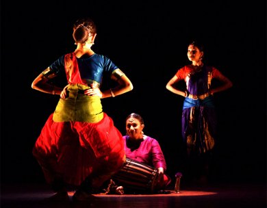 Pratikriya shows how dance responds. The dance liberates the dancer from the shackles of stillness. And dance creates magic and beauty, its aesthetic dimension in response to rhythmic beats. The next stage in the ecstatic journey is Samyoga, for dance merges. The stage is aflame in sparkling of nritta. The dancer merges in Siva, the archetypal dancer. And the entire universe dances: Ananda Tandava. Samyoga alters the visual physical space around the dancer: the dance becomes the dancer, the dancer the dance. "I transform from copper to gold. I become a manifestation of his Ananda Tandava, where everything that moves in this universe, is a harmonious beautiful dance. He dances, the world dances, I dance, and we all become one. Samyoga." A fusion of other dance forms highlight Nimagna (Dance immerses). The dance recital takes us through mystical India down the centuries. The mysticism of Rumi (the 13th century Persian mystic) is cast in sufi dance. The costume and the slow whirling dance design is a contrast to Bharatanatyam, but merges beautifully with the text and the spirit of the dance. "Dance is not only about feeling light like a falling leaf; it is about tearing your heart out to become one with the Supreme. It is about rising out of your body to be suspended between the two worlds," the sufi dancer relives Rumi on the stage. "I will wear bells and dance to celebrate my love for Krishna." It is Meera, in folk idiom, immersed in a love that surpasses everything. Lalleswari, the 14th century Kashmiri Tantric, springs up.... "I learnt to withdraw my gaze from without, to look within....And when I realized the truth I shed my clothes, and began to dance naked." However, the dancer enveloped in black costume fails to convey the secrecy of the Tantric. Muthuswamy Dikshitar, the 19th century poet, rounds off the theme. The palanquin bearers of a temple procession dance in ecstasy which mirrors the dance of Siva himself: the group dissolves into a Bharatanatyam nritta in a dazzling performance.