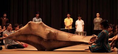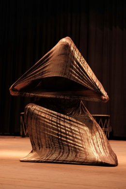 A glimpse of Dr. Anita Ratnam’s recent work on re-reading the story of Ahalya, set the tone for the evening. Covered in a golden piece of cloth, Ratnam depicted with movements within the cloth, how Ahalya, a woman of pure gold, was imprisoned in stone and how she breaks out of it, finding her voice and questioning the injustices faced by her. This was followed by a performance which was built on the general idea of contact where the performers carved out various imageries of interconnectedness. Effortlessly taking up different shapes of the wall, the wave or the mountain, the performance visually represented the sense of collective that can emerge through such interconnectedness. The most striking imagery was of the wave. The solid fluidity of the wave was captured by the same golden cloth used earlier, which was stitched in the shape of a cylinder with openings on two ends. While two bodies moved inside the cloth, the cloth took continuously flowing shapes resembling waves and two other performers also engaged with the waves from outside the formation. One may interpret that it is only through interconnectedness can collective formations, just like the wave, emerge. One can also say that, through such contact with our selves and other bodies that a sense of belonging can come. The use of voice in the performance was a symbol of the ‘voice’ of the silenced women, which found expression through the movements, songs and poetry. The recitation of Maya Angelou’s poem ‘Phenomenal Woman’, coupled with bold movements invoked ideas of liberation and freedom. How one’s own bodies and ‘spaces’ can be reclaimed through self-realization of the body was also indicated through clapping of hands and stamping of feet. Anita Ratnam’s rendition of Bharatanatyam bols here reiterated the idea that through dance, violence of confinement and boundaries can be questioned.