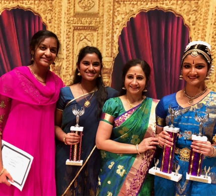 Sujatha Srinivasan at the Cleveland Thyagaraja Festival April 26, 2018 ![]() Sujatha Srinivasan The 2018 Cleveland Thyagaraja Festival, the largest Indian music and dance festival held outside India, featured the Bharatanatyam performance of Guru Sujatha Srinivasan and her students on the last day at the Waetjen Auditorium, CSU. Accompanied by a live team of musicians, Sujatha presented a traditional repertoire, including songs dedicated to the legendary dancer T. Balasaraswati. Tiruvarur Girish and his disciple Lalit Subramaniam rendered vocal accompaniment. Shriya Srinivasan, Joshua George (nattuvangam), K.H. Vineeth (mridangam), R Thyagarajan (flute) and Sushmitha Ravikumar (violin) enhanced the presentation with their expert skills. ![]() Aradhana Award - Sweta Balaji, Sita Vakkalanka, Guru Sujatha Srinivasan, and Nithya Kasibhatla Shriya Srinivasan, Nithya Kasibhatla and Sita Vakkalanka, students of Sujatha, exhibited their good training, dancing along with their guru. As artistic director of Shri Kalaa Mandir- Center for Indian Performing Arts, Cleveland, Sujatha has been successfully creating the next generation of front ranking Bharatanatyam artists. Sujatha's senior student Nithya Kasibhatla won the Grand Prize at the Bharatanatyam dance competition with an award of $1500 and a performance at the Chennai music and dance festival. Sita Vakkalanka and Sweta Balaji, also disciples of Sujatha, bagged top prizes in their categories among 270 competitors. |