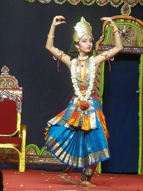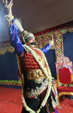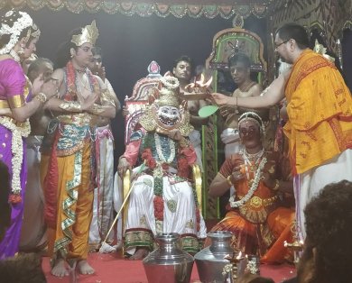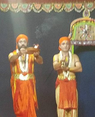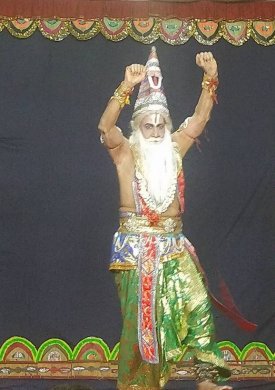 Bhagavata Mela's Prahlada Charitam - A ritual art - Ramaa Bharadvaj e-mail: ramaabharadvaj@gmail.com May 30, 2018 The heat of the month of May, may herd everyone indoors towards air-conditioners, but in the village of Melattur in Tamizhnadu, a group of artists defy this heat of Nature with the heat of their own penance like dedication, as they prepare for their annual festival. They are the Bhagavata Mela artists of 'Sri Lakshmi Narasimha Jayanti Bhagavata Mela Natya Nataka Sangam'. The group is familiarly known as Melattur Natarajan's group, named after a soft spoken man, who has kept alive the Bhagavata Mela tradition revived by his grandfather Ganesa Iyer in 1938 in Melattur. Bhakti oriented Bhagavata Mela plays are regarded as Tamizhnadu's only surviving link to ancient Sanskrit Theater. Today, this hereditary tradition is continued by 75-year old Natarajan and his brother Kumar playing the main characters with participation from art enthusiasts from outside the traditional families. The Festival, now in its 78th year, was held for 9 days (May 19 to 26, 2018), and presented performances on an outdoor stage erected in front of the Varadaraja Perumal temple. It featured Bhagavatamela natakams as well as classical dance and music performances by invited artists from different parts of India. The main attraction of the festival was the Prahlada Charitam drama written by Melattur Venkatrama Sastry and performed on the inaugural night. Rendered by an all-male cast, this 7-hour long play which began at 10pm and concluded at dawn, proved to be a test of the physical stamina and mental concentration of the dancers, actors and musicians. Although the story is a familiar one of the fourth avatar of Lord Narasimha, it takes on a ritual significance on the Bhagavata Mela stage. Firstly, the length of the play is timed such that the final killing of Hiranyakasipu by Narasimha happens at dawn - that time of non-day and non-night - for after all, the rakshasa king had asked a boon of not dying either during day or night. Secondly, the actor playing the role of Narasimha goes through a cleansing fast for 24 hours in preparation of receiving the mask's Narasimha energy. Thirdly, the mask itself is worshipped throughout the year in the temple and is ceremoniously brought backstage only on the day of the event. The preliminaries before the main story, begin with the appearance of konangi, a humorous character of Andhra Pradesh, with mythical significance. This amusing clown is said to have been created by the Gods to make Ganesa laugh, so that the discus of Vishnu which he had playfully swallowed would be ejected from his belly when it shook with laughter. Following this, purvaranga worship is performed through offering of aromatic smoke, lamps, holy water and flowers to the 8 directions. This aspect had gone out of the play a century ago, and was revived by Natarajan, in compliance with Natyasastra's prescriptions. The Todaya Mangalam that follows establishes the Bhajana Sampradaya connection. ![]() Konangi ![]() Purvaranga puja ![]() Srikanth as Vinayaka ![]() Kumar as Hiranyakasipu One of the aspects of Indian theater is that the synopsis of the entire story be spoken by the sutradhar in the beginning. In this presentation, that was accomplished splendidly by Aravind (a Chartered Accountant from Bengaluru) and the ever-popular Srikanth Natarajan, through their skillful dance rendition of the Prahlada Sabdam which narrated the full story in a nutshell. This was followed by the appearance of Ganesa. It is interesting to note that "Ganesa Patrapravesa" used to be an important but simple aspect of the play. But with a professional Bharatanatyam dancer like Srikanth donning the Ganesa mask, it has not only grown longer in duration and but also incorporates impressive rhythmic displays. The appearance of Hiranyakasipu enacted by Kumar was as dramatic as a camera moment in a cinema in revealing the film's hero. Sitting on a throne with his head bent into his chest, he begins with striking his feet, and when he finally lifts his head to "reveal" himself, his arrogant head nods, forceful foot taps, haughty reclining postures, swaying body, and pompous eyebrow lifts, turn that narrow throne into his entire stage. Yes, for a full 6-minutes, he never leaves the chair and yet spectacularly terrorizes everyone with his demeanor. It must be mentioned that the family assigns this role only according to divine ordinance. Mr. Natarajan told me a few years back, that in 1977 their father, the legendary Swaminatha Iyer who played Hiranyakasipu, received a Divine Order to immediately train his younger son Kumar for the role. Although not happy at having to give up the role, the father obeyed the Order. The very next year, the reason became clear, when a surgery resulted in the removal of Swaminatha Iyer's vocal chords. One might wonder why Divinity would take such special interest in the casting of this rakshasa character. The answer that comes to my mind is this - that Lord Vishnu, in his compassion, is keeping an eye out for one of his own staff members! After all, as the myth goes, this rakshasa was once Vishnu's doorkeeper in Vaikuntha, who had been cursed by the sons of Brahma to be separated from Vishnu and be born as a mortal on earth. The Lord is said to have offered him a quick return to Vaikuntha after just three births if he agreed to be born as Vishnu's foe and meet his end at the Lord's hand, versus seven births if he were to be born as a devotee. Hiranyakasipu of the Satya yuga, Ravana of Treta Yuga and Shisupala of Dvapara Yuga are said to be the three births of this doorkeeper. The character of queen Leelavati, exquisitely enacted by the legendary Natarajan, was not only full of grace but also noteworthy in its mature choreographic thoughts, and spontaneous improvisation skills. Even while making his entrance in a patrapravesa daru behind a hand-held decorative curtain, his turmeric smeared feet bespoke t