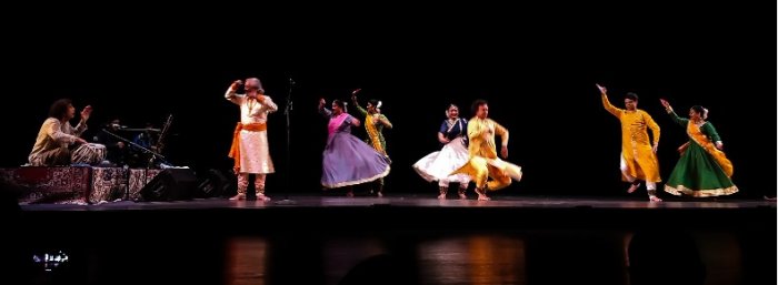 The evening was split into two halves. While the first part focused on Guru Vandana by Rita Mustaphi and her students followed by solo dance performances of Saswati Sen (principal student of Maharaj) and the Kathak king respectively, the second half spun around the performances of Maharaj and his progenies. Throughout the program Pt Birju Maharaj was accompanied on tabla by Ustad Zakir Hussain. The evening started with lamp lighting ritual by Mustaphi performing an arati of Maharaj on stage which set the mood of Guru Shishya Parampara. He was felicitated by Katha Dance Theatre and Ustad Zakir Hussain marking the beginning of the ceremony. This was followed by Guru Charanan (a composition by Birju Maharaj), offering reverence to the Guru by Mustaphi and her students. The very first item of the evening from the house of Maharaj was Krishna Vilas, performed by Saswati Sen. Then came the most awaited moment of the evening when Pt Birju Maharaj entered the stage and enthralled the audience with his nritta. This was not the first time I was watching the maestro or Zakir Hussain performing live in US but watching them together on the same stage was certainly a lifetime experience. The mystical chemistry that these great masters have while they travel together in their rhythm journey transports audiences to another world far away from mundane chores. The duality created by the king of Kathak and the doyen of tabla when they shared and challenged each other in crisscross rhythmic passages in the time cycles of 16 beats – Teental – led to an other worldly experience. Their masterpieces focused around Lord Krishna and his leela. I have heard tales of these two legends performing together even before I was born and how it used to catalyze adrenalin rush of the onlookers. The same happened that day and I could feel goosebumps as the masters performed. Vocal support to this part of the program was provided by Maharaj’s son Deepak Maharaj. The second half of the program was a blissful showcase of Parampara Pravah which means the eternal flow of tradition. Pt Birju Maharaj’s family who accompanied him on his US tour included Deepak Maharaj (son), Mamta Maharaj (daughter), Shinjini Kulkarni and Ragini Maharaj (granddaughters), and Tribhuwan Maharaj (grandson). The entire family set the stage on fire with their spectacular footwork, breathtaking expressions and subtle abhinaya. Each of them represented an avatar of Pt Birju Maharaj thereby proving they are the true flag bearers of the Kathak king’s tradition by every possible means. Shinjini performed Jhaptal (rhythmic time cycle of 10 beats), Tribhuwan performed Ashtamangal (asymmetric pattern of an 11-beat cycle), Ragini performed Chautal (lyrical grace and rhythmic strength in 12-beat cycle). Three of them created beautiful patterns while taking their turns and interacting gracefully on stage through powerful eye and facial expressions. Deepak Maharaj performed Layakari (rhythmic time cycle of 13 beats, Taal Jayat) which was followed by Saadra, an abhinaya depicting the war between Lord Rama and Ravana. Mamta Maharaj performed Dhrupad Ang interlaced in pattern of 14 beats, Taal Dhamar. Saswati Sen performed Pancham Sawari (rhythmic patterns woven in the complex 15 beats configuration) and concluded with her iconic chakkars covering the entire stage. Before each presentation, each performer followed the maestro’s style of explaining the nuances of the rhythmic pattern by reciting the parhant which made their performances not only visually appealing but also easier to understand. They were accompanied by Anirban Bhattacharyya on vocal, Chandrachur Bhattacharjee on sitar and Utpal Ghoshal on tabla.The Paramapara Pravah continued with Pt Birju Maharaj performing Thumri and Gat along with Ustad Zakir Hussain again on tabla. This is an expressive composition by the master portraying the playful mischief of Lord Krishna with the milkmaids and a story depicting the childhood of Krishna. The climax of the evening transported the audience to a godly biosphere where the entire galaxy came down upon the stage. The star-studded cast performed a Chaugalbandi, as Maharaj would call it. The four coordinates of the challenge were Pt Birju Maharaj, gen-two Saswati Sen, Mamta Maharaj and Deepak Maharaj, gen-three Shinjini, Tribhuwan, Ragini and finally Ustad Zakir Hussain. Maharaj started the footwork which was echoed by gen-two next, followed by gen-three and passed on to Zakir Hussain which continued until it reached the zenith of rhythm rhapsody. This was the finale of the evening where three generations of Kathak were brought on the same stage.
