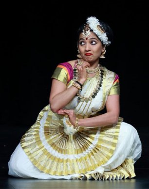 Raagamayi: Devotion in dance - Minnie Homchowdhury e-mail: Mhomchowdhury@hotmail.com November 25, 2018 If dance is the hidden language of the soul, of the body, and love is the language of the universe, then together they make a dynamic combination to reveal the inner landscapes of the mind. The Mohiniattam dance repertoire 'Raagamayi' presented by Dr. Sunanda Nair and her team, on November 11, 2018 at the Weiss High School in Austin, TX, was a perfect platform to witness the magic of dance and explorations of love in its many forms. Raagamayi loosely means "one who is committed in love or devotion". The dancers used graceful, swaying movements of the Mohiniattam dance form of Kerala to create a vision of the gently swaying palm trees, the undulating ocean waves and the lush, scenic landscapes native to the state of Kerala, to tell stories of love that ranged from a mother's love for her child, a lovelorn heroine's longing for her lover, and finally a devotee's spiritual, all-encompassing love for her maker. ![]() Sitting: Sarita Warrier & Arathi Remesh; Standing: Suja Pillai & Divya Shanker The program began with a traditional invocation "Paripaahi Ganaadhipa" performed with sparkling energy by Aathira Vijayakumar and Mamata Vasantkumar, two of Sunanda Nair's most promising young shishyas.This moved seamlessly into the 'Mukhachalam,' a pure dance item, executed expertly by her senior shishyas, Arathi Remesh, Divya Shanker, Sarita Warrier and Suja Pillai, who displayed mastery of the Mohiniattam adavus or step patterns throughout this dance. The next piece was a solo padam "Omanathingal," essentially a lullaby put to poetry by Irayiman Thampi for Maharaja Swati Thirunal. Dancer Gayathri Prasanth's charming portrayal of a doting mother, who sees the light of divinity in her child's pranks, was accentuated by the lilting melody of Kalamandalam M.S. Gireesan's rendition of the padam in ragam Navarasam. ![]() Gayathri Prasanth From a charming lullaby, we swiftly moved into a world of complex, emotional expressions in the 'Ashtanayika.' Sunanda Nair's shishyas once again held the audience's attention as they navigated the intricacies of a maze of emotions through a montage of ragas, depicting the Ashtanayikas as envisioned by Dr. Kanak Rele as the following eight heroines. Vasakasajjita, as one who eagerly awaits a union with her lover, Arathi Remesh took us into her joyous mood as she prepares her heart and home. As Virahotkanthita, the separated one, Sarita Warrier convincingly played the sorrowful heroine who realizes that despite her preparations, her lover has not arrived. Svadhinabhartruka is the independent and confident heroine. This is an interesting character portrayal of one who is in love, but in command of her circumstances and Divya Shankar showed the quiet, control of the heroine who cannot be easily fooled. In Kalahantarita, the inconsolable one, the nayika becomes quarrelsome and refuses to be consoled. The feelings of disapproval were subtly and aptly portrayed by Suja Pillai. As Khandita, Arathi returned to demonstrate the seething anger and disappointment of the heroine who catches the hero in a compromising situation. In Vipralabdha, the dejectedness yet hopefulness of this personality are contradictions which Sarita returned to show through changing expressions. As Proshitabhartruka, Divya returned to show her abhinaya of the heartbreaking sadness of a heroine, whose lover is leaving on a long journey, filling her heart with woe. Finally as Abhisarika, there is excitement, despair and a strange boldness in Suja's painting of this nayika, who abandons all care in search of her lover. Sunanda Nair took the stage for the second half of the evening's performance and it was a visual treat for the audiences to see what she has achieved with her mastery of the Mohiniattam dance form. Added to that, is her multi-disciplinary training in several of the Kerala arts as well as Bharatanatyam and the ancient texts. Through her work she pays tribute to the doyen of Mohiniattam, Dr. Kanak Rele, as well as her other notable gurus - Kalamandalam Krishnankutty Warrier, Gurus Deepak Mazumdar, Mahalingam Pillai, Kadirvelu Pillai, Kalamandalam Sivan Namboodiri, Kalamandalam Gopi and Mattannur Sankarankutty. So vast is her dance journey that it has recently been chronicled by national award winning film director Vinod Mankara in a documentary 'Laasyam, The World of Sunanda Nair', which the audience was treated to a sneak peek trailer of, leaving us eagerly waiting for its full worldwide theatrical release. ![]()