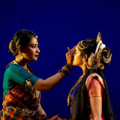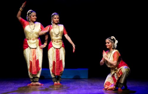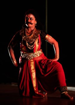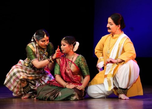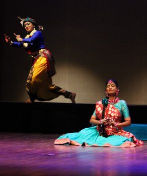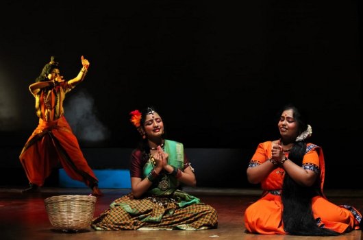 Kani Kathamani- the fable of the kuravanji presented by Jain University's students - Sumangala Varun e-mail: sumangalavarun@gmail.com December 2, 2019 Bengaluru rasikas were treated to a unique Bharatanatyam production on the folk fortune teller kuravanjis on October 31, 2019. The third semester Master of Performing Arts students of Jain University presented Kani Kathamani, a group presentation on the kuravanjis of Karnataka. The production was a part fulfilment of their course. All aspects were handled entirely by the students. This was the first time that a production on the kuravanji was presented in a group format. The script was composed by the students based on Dr.Manorama B.N's research and the music was composed by D.S. Srivatsa. The jathis were by D.V. Prasanna Kumar. The music ensemble for the evening was headed by Srivatsa on the vocals, Prasanna Kumar on the rhythm pads and special effects, Lingaraju on the mridangam and Gopal at the veena. ![]() Sutradhar dancers The event began with a brief introduction to the origin of the kuravanji. According to Dr. Manorama's research, it is Lord Shiva and Devi Parvathi who take the form of local soothsayers (kuravan and kurathi) to console a childless Dasaratha. After giving the king a vision of his four sons and their feats, Shiva and Parvathi return to Kailas and leave the kurava and kurathi roopa behind on earth. The students used folk elements in the dance and costumes, replete with shell necklaces, beads and feathers. They also used props effectively across all segments. The students opted to present three stories with the kuravanji as the central character. Three dancers played the role of sutradhars, performing the jathis before each story, and a brief narrative of the story that followed. Their costumes were simple off white and ornaments closely coordinated. Hanumantha kuravanji ![]() Hanuman kuravanji ![]() Ravana The first story was about how Lord Hanuman visits Sita Devi when Ravana is holding her captive in Ashoka vana. The piece began with a vigorous jathi. Then followed a brief interaction between Hanuman and two vanaras as he changes his appearance into that of a woman, replete with folk attire and ornaments. Hanuman's interaction with the monkeys was fun, with him teasing the monkeys as they observed his ornaments and watched him transform into the kuravanji. The kuravanji then approaches a forlorn Sita and gives her a glimpse of the future where Lord Rama defeats and kills Ravana in battle. The scene was depicted by dancers in the background with fluid movements. Brahma kuravanji ![]() Brahma kuravanji ![]() Krishna-Radha The second story was how Lord Brahma takes the form of a kurathi and visits Vasudeva and Devaki, who are expecting their eighth child and are still mourning the deaths of their seven children. The couple is filled with dread at the impending fate of the eighth child at cruel Kamsa's hands. The kurathi shows them how the child will survive Kamsa's hands, will live a happy childhood in Gokula and when the time comes, will kill Kamsa and rid the earth of his atrocities. This segment provided the maximum scope to the dancers for elaboration. The depiction of the Yamuna in spate and the river parting for Vasudeva to cross was impressive with apt use of karanas. The kurathi shows the various feats of Krishna, including Kalinga narthana, lifting the Govardhana during the rains and dancing the rasaleela with the gopis. Srinivasa kuravanji ![]() Srinivasa kuravanji ![]() Srinivasa The final piece for the evening was on the story of Srinivasa and Princess Padmavathi. When Srinivasa (an avatara of Lord Vishnu on earth) saves Padmavathi from a wild elephant in the forest, it is love at first sight for the pair. A smitten Srinivasa wants to send a proposal to King Akasaraja and Queen Dharani Devi, the princess's parents but is hesitant to do so as he is a common man and she is a princess. He decides to take the form of a kuravanji and meets the Queen and speaks about Srinivasa. He tells her that Padmavathi is destined to marry Srinivasa and urges her to bless the union. Padmavathi playing with her friends and her meeting Srinivasa were neatly executed. Conclusion A thillana in Valachi provided a fitting finale to the evening. The presentation concluded with a Mangalam of all three deities by offering them arathi and a uyyale seva. The impact could have been deeper if the performers had chosen to wave the arathi with turmeric water and lit camphor with the deities offering dakshina, instead of the empty plate that was used. All three dancers who played the kuravanjis were apt for the role of the fun loving and bubbly kurathi. They had the presence of mind to cover small hurdles and improvise when needed. The students had hand-made a lot of the aharya. The costumes and makeup for characters appeared to be well thought through. The event was presided over by Prof. Vijaya Marthanda, who was the external examiner, Dr. Manorama B.N., and senior gurus including Sathyanarayana Raju, Jyothi Pattabhiram, Kiran Subramanyam, Rekha Dineshkumar and Roopashree Madhusudhan among others, some of whose students were part of the production. The faculty comprising of acharyas Shobha Sasikumar, Dr. Soundarya Srivatsa, Sheela Chandrashekhar, Madhulika Srivatsa, and Arun Sreenivasan were also present. Shobha Sasikumar explained the process of how the students prepared the production. She noted that the students had taken every aspect very seriously. Acknowledging Dr. Manorama's work on the kuravanji, Sasikumar said, "We are grateful to committed and generous researchers who take up such topics and share it with us." She also thanked the students' gurus who send them to enrol in the course with trust in the university and faculty. Vijaya Marthanda noted, "The full hall and applause suggest the quality of the program." She also said that the graph of the choreography's quality keeps going up each year. Dr. Manorama said, "We eagerly await
