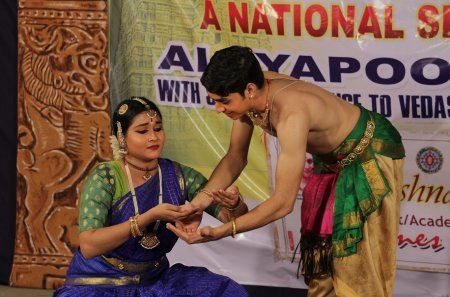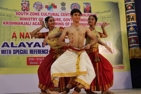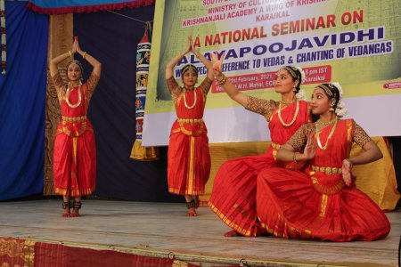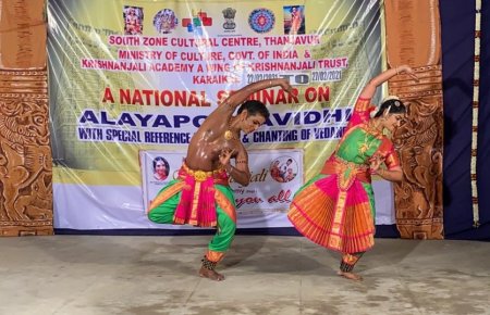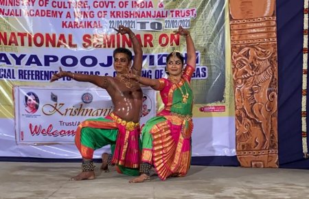 Two day national seminar with special reference to Vedas Photos courtesy: Krishnanjali Academy May 13, 2021 South Zone Cultural Centre, Thanjavur, Ministry of Culture, Government of India and Krishnanjali Academy, a wing of Krishnanjali Trust, (Chennai/Karaikal) together presented a two day national seminar on Alayapujavidhih with special reference to Vedas along with Agama chanting on 20th and 21st February and chanting of Vedas from the 22nd to 27th February 2021 at the temple town of Karaikal, curated by Karaikal V Balagurunathan, Director of Krishnanjali Academy, and founding member of the Krishnanjali Trust. The first two days of the national seminar began with special decoration of idols by V. Yogesh Sivachariyar from Karaikal. This was followed by Veda parayanam, where the acharyas chanted holy texts from Atharva Veda, Rig Veda and Yajur Veda on the first and second day. On both days this was followed by Nivedhya aradhana and Mahadeepa aradhana of the idols. The inaugural ceremony was held on the first day in the presence of esteemed guests. The afternoon sessions focused on chanting of Veda Agamas, Sastras, Darsanas by six esteemed scholars from Chennai on both days. This was followed by sangita upasana, a rendition of Nama Sankirtanams by Sivasri Skandaprasad who was accompanied by Nagai Sriram on the mridangam. Her rendition of the Mukti Margam with reference to the kali yuga was transcending. Sivasri says, "In this age of quarrel and hypocrisy the only means of offering and attaining mukti (salvation) is through chanting the holy name of the Lord." Nama Sankirtanam is nothing but the constant chanting of the Bhagavan Nama. This sangita upasana was welcomed by the general public and moved the audience through hymns, chants and prayers thus promoting the idea of togetherness and belief. ![]() Krishnanjali troupe ![]() V Balagurunathan A natya upasana was presented by V. Balagurunathan and his students from Krishnanjali Academy, Karaikal on Sanskrit krithis. The performance opened with a well known Vinayaka kauthvam in Gambhira Nattai calling upon Lord Ganesha. Special mention to Parshwanath Upadhye and ABHAI for giving the opportunity to learn such a composition. The students performed a series of short songs from the Ganesha kauthvam to the famous composition on Lord Ayyappa "Harivarasanam". These performances consisted of little children to young adults dancing together in unison showcasing their talent. The senior students performed a traditional Kalakshetra jathiswaram in Ragamalika which was followed by a kirtanam "Asaindhadum Mayil" composed by Oothukadu Venkata Subbaiyar in ragam Simhendramadhyamam. The performance came to an end with the beautiful bhajan "Sri Rama Chandra" praying for moksha to Lord Rama in ragam Hamsadhwani, set to misra chapu. On the second day, the vedagama chantings were followed by musician Srikanth Gopalakrishnan rendering krithis of Muthuswami Dikshitar based on the sthalams. He began with "Shri Mahaganapathih avathu maam" in Goulai and mishra chapu. The Goulai transcended and turned into a vibrant Nattaikurinji composition "Parvathi Kumaaram Bhavaye" from the sthalam Virinchipuram. From Virinchipuram, travelling all the way to Chidambaram, he rendered "Aanandha natana prakaasham," a famous composition in Kedaaram. This was followed by "Kamalaambaam bhajare" in Kalyani which is one among Navaavarnam. From the Ayodhya sthalam he rendered the "Raamachandram Bhaavayani," the famous composition in Vasanta ragam and talam rupakam. Travelling towards Karaikal, the next one was "Angaarakam Aashrayaamyaham"' in ragam Suratti from the sthalam Vaitheeswaran Kovil which belonged to one among the Navagraha Kritis of the composer. Following this "Shri Kaanthimathim" in Haimavathy and to conclude the splendid upasana one among the Nava Kritis on Shri Mahalakshmi, "Maaye Chithkale" in ragam Shankarabharanam was rendered. ![]() Roja Kannan's troupe ![]() Roja Kannan Roja Kannan, President ABHAI, presented natya upasana. The program was curated especially with the compositions of the Trinity of Carnatic Music namely Thyagaraja, Muthuswami Dikshithar and Syama Sastry. The compositions of the Trinity have transcended the test of time and have withstood the onslaught of several invasions and revolutions in the country. These compositions though mainly composed for vocal music are so adaptable to the explorations through the medium of Bharatanatyam also. This was amply proved by Roja Kannan and her disciples Tvisha Vadhul, Vaishnavi Srinivasan, Shruthi Bhuvaneshwari and Nivedha Harish. The presentation commenced with the kirtanam of Muthuswamy Dikshithar, "Ananda Natana Prakasam" in Kedaram ragam and misra chapu talam.This kirtanam extols the Ananda Thandavam of Lord Nataraja at Chidambaram and was choreographed with interesting rhythmic interludes by Guru Adyar K Lakshman. Following this the group presented the celebrated Pancharathnam of Saint Thyagaraja in the ragam Sri set to adi talam, "Endarao Mahaanubavulu". The choreography included interesting rhythmic interludes along with intense emotional interludes explaining the lines that the Saint had so poignantly written extolling the many good hearted souls present in this world. Next came a very soulful presentation of Syama Sastri "Maayamma" in the ragam Ahiri and adi talam by Roja Kannan. The different episodes of the epic Ramayana were interestingly interspersed in the Thyagaraja kirtanam "Nannu Palimpa" in the ragam Mohanam and adi talam. The dancers played the role of the different characters in the Ramayana and brought out the episodes of Ahalya Chaapa Vimochanam, Jatayu Moksham and the abduction of Sita by Ravana to the delight of the audience present. Next came a kirtanam from Thyagaraja's Nauka Charitram, "Gandhamu Puyyaruga", in an interesting group presentation. The program concluded with a Mangalam praising the Trinity in Sanskrit penned by Dr. Ravi Sharma and set to music by Radha Badri. The discerning