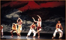 As usual, the company offered a couple of New York premiers - Kolam, commissioned by Yo-Yo-Ma’s Silk Road Project with music by Zakir Hussain and Ethan Iverson, a jazz-pianist, and Serenade, a solo performed by Mark Morris himself. Both dances had an Asian flavour. Kolam as the name would suggest, was inspired by Tamilnadu floor painting and included many elements from Indian movement traditions. Serenade had many moments that were pure Japanese, though some spectators even saw Indian ones in it. While the bulk of Mr. Morris’ work is set to western classical music – ranging from early masters like Bach and Handel to the more contemporary work of composers like Virgil Thompson and John Adams – he is also attracted to folk and popular music. In fact, one of his opening night offerings was set to the very American square dance music of Bob Wills and His Texas Playboys! From the early days of his company (which opened in 1980 at the Merce Cunningham Studio in 1980) he has choreographed works to traditional songs from many different cultures – Romania, Tahiti, and Thailand. In the early ’eighties he set two dances to south Indian music: O Rangasaayee sung by M. S. Subbalakshmi, and Tamil Film Songs in Stereo (Pas de Deux). The first was a solo for Mr. Morris; the second a humorous interaction between student and teacher. Mr. Morris has had an association with south Indian music and dance since he first studied Carnatic music as a young man, to his later tours in India when he struck up friendships with dancers like Chandralekha, whose great fan he is, and Lakshmi Vishwanathan, whom he even invited to teach a workshop to his company. So his choice of a south Indian inspired piece as his part of The Silk Road Project is not surprising. Kolam opens with a couple of dancers either standing on their heads or taking other yoga poses downstage left, as a huge abstract multi-coloured painting is revealed as backdrop and main element of set design. In the orchestra pit, sits Zakir Hussain surrounded with his percussion instruments, Ethan Iverson on piano, Wolfram Koessel on cello (in Berkeley the cello was, of course, played by Yo-Yo-Ma), and Reid Anderson on bass. Slowly the dance unfolds. Two dancers carry a third, who seems to ‘tread water’ until she is set down on stage and falls into an Odissi-like pose. This motif is repeated several times, until they start to move around the stage, thereby creating shifting patterns (kolam-like?) on the floor. Occasionally one takes a nataraja pose, while at other times someone else undulates her or his arms as sinuously as a snake dancer. Dressed in plain pyjamas – with colourful choli-style blouses for the women, the dancers often strike attitudes that, while they look generically like modern dance seem also to be inspired by Indian dance elements – a flexed foot here, and there, two bent arms held to one side, reminiscent of an Odissi tandava pose. Towards the end, all ten dancers appear in what seem like Kathakali ankle bells. Standing with loosely relaxed knees (rather than in any kind of half-seated position of ara mandi or ati bhangi) they start to work their feet – stamping rhythms on the floor. The music, since the Indian input is by Zakir Hussain, is more north Indian in flavour than Carnatic. At times the cello sounds like Sultan Khan’s sarangi and even breaks into a lahara section. But while Mr. Hussain’s percussion is always interesting, in Kolam it lacks fire, since it is largely set within the confines of western compositional conventions. As Ms Kisselgoff, dance reviewer for the New York Times, commented, Mr. Hussain “was relegated uncharacteristically to the equivalent of second fiddle.” Unlike the accompanists for Mr. Morris’ solo Serenade, he wasn’t even seated on stage. The star of the evening was, of course, Mr. Morris - who, though rather portly at 45 - still commands the stage with the magnificence of his personality. Dressed by Isaac Mizrahi in a black sarong-like skirt and white wrap-around top, he played with several small, often musical, props – a set of finger cymbals, a pair of castanets, a fan, and even a cylinder lit from inside. At one moment he looked like a samurai warrior spending a leisurely moment in a martial arts version of buyo (female Japanese dancing). At another, with his castanets, he brought alive the feel of a jota, the popular Spanish folk dance. Whether he sat majestically, swirling his head and undulating his arms, or glided around with his illuminated cylinder, he had us in the palms of his hands, wondering what he would ‘quote’ from next, how next he would raise a gurgle in our throats. For in the