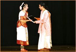 Aasish Cherukupalli, performed the Sutradhara’s role. A long time disciple of Satya, he has thrilled the audience many a time in the past. He was the nattuvangist too. He narrated in English and enacted in dance what the audience were to experience. The performance started with the invocation of deities of Vazhuvoor temple from where the style of Bharatanatyam originates. After the traditional prayer and Pushpanjali, the audience was invited to experience all the Navarasas starting from Shringaram and culminating in Shantam. Selection of episodes was thoughtful and the choice of participants was appropriate. From the end result, it is amply evident that Satya did her homework and did it well. In Sringaram, we enjoyed the poetry of three languages – Sanskrit, Malayalam and Kannada in two facets of the rasa - amorous and vatsalyam. Satya herself enacted the archetype of eternal lover Dushyanta with her senior and talented student as Shakuntala. In Vatsalyam a little girl delighted us as baby Krishna. She interacted with captivating mother Yashodha. Satya also appeared in the role of Ravana in Bhibatsam sharing the action with Sita. I have been itching to see Satya in a dance recital, but here I saw the performance of the entire Nritya Saagaram family. Certainly a bonus. Images of Hindu deities in dance sequences are pretty familiar, but the choreography this time made some of them unforgettable. In Raudram, Durga showed all the 18 hands. In Adbhutam the churning of the ocean by Devas and Asuras culminated in Parvati stopping the poison at Shiva’s throat. And the song Chandra Chooda in ragam Sankarabharnam initiated the devotees into a sense of wonder. In Bhayanakam, gopis spot a silver boat on the horizon, enter into it, and then encounter a torrential storm to learn a lesson in humility. These are composite images revealing the detailed work done on rhythm, music, movement, poetry and costuming. The Shantham based on prayers from the Jain tradition for peace and harmony was the right culmination of the show. It moved the audience intensely. The slide show of various symbols of peace enhanced the effect. The message of peace came out loud and clear. Thillana in ragam Brindavana Saranga followed by mangalam had its own surprise in the brilliant stage pictures and high quality choreography. The concept for the ballet was given by T K Govinda Rao. The music composition and vocal recital by the celebrated artist Saavitri Ramanand evoked emotions and articulated the spirit of each dance episode. Her melody and technical resources effectively guided each step and each gesture of the young dancers. Her music helped them to identify with the objects of their expression. Murali Balachandran on mridangam, Bala Skandan on violin, Radhakrishnan on flute, and Pavithra Sunder on keyboard were simply magical. To give an extra dimension to the performance, Satya invited Dr. Kiran Bedi, a highly vibrant and deeply committed personality to preside over the function. To quote her... “ I am absolutely impressed with Guru Satya in whatever I heard and saw today. Satya, you are perpetuating and transferring the culture to both Indians and non-Indians alike. I am deeply touched. You have created an India here. I do believe that parents who invest in their children will reap rich rewards. In your missionary zeal of teaching dance, you are serving God, humanity and Indians. To the parents…you are good Indian parents… I feel the warmth, love, camaraderie and family spirit tonight. As parents, as Indians and as friends you are going to reap the benefits and this investment will make your children different and outstanding.” Dr. Kiran Bedi’s words of appreciation and encouragement came from her heart. In her speech, she addressed the collective psyche of India. The master of ceremonies for the evening Dr. Pradeep Gopalakrishna surely set the tone for the program. Mr. Rabindranath Panda, Consul for Education and Culture representing Consulate General of India, New York congratulated the dance academy in their efforts to present India’s heritage and culture in a sincere, authentic and appreciative manner. He stated that the performance distinctively stood out from other such performances. Satya Pradeep