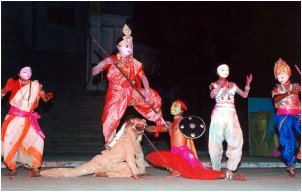 Keeping in tune with the intentions of the organisers to present every year one contemporary interpretation of a particular dance tradition along with traditional troupes of martial artists, the Samudra group led by the talented duo Madhu Gopinath and Vakkom Sajeev, presented its own original choreography ‘Sound of silence’. The work evolves through different stages creating a sort of visual collage, which through an impeccable technique borrowed from martial and traditional art forms of Kerala, seeks to create a dialogue between movement and sound, tradition and modernity. Particularly impressive was the descent from the rope at the beginning of the play and the climb at the end; with the white stupa in the background and the vast expanse of stars on the top, the impression was that of a flying angel coming from and returning to the sky. There are several myths to explain the origin of kalarippayattu, the martial art form of Kerala, believed to have originated in early 4th cent. A.D. According to some it was instituted by Lord Parasurama in order to defend the land of Kerala which he himself had reclaimed from the Arabian sea. According to others, it was invented by goddess Parvati when she went to assist god Shiva during his tapas in the jungle. It seems that while waiting for her husband to wake up, she studied the movements of the fighting animals and wrote them down on the lotus leaves. At the end of his tapas, Shiva saw the notes and became so impressed that he decided to teach the technique to the devas for their fight against the asuras. The CVN Kalari was established in Calicut in the year 1945 by late Sri Narayanan Gurukkal who, along with his counterpart Sri Govindan Kutty of Trivandrum, was responsible for bringing the art of Kalarippayattu to limelight and to propagate it all over the world through stage presentations and lecture demonstrations. At the Kalinga Mahotsav the group, lead by Sri Narayanan’s son Sunil Kumar, presented items belonging to the three phases of training, the ‘meythari’, a set of body exercises to attain control, balance and stamina, the ‘kolthari’, which includes fighting exercises with various types of wooden sticks and ‘ankathari’, which concentrate on attacks and defence using metal weapons like dagger, sword and spear. The entire team demonstrated to be extremely competent in all the different sets of exercises; speed, precision, agility and an acute sense of concentration marked each stage of their performance . If kalarippayattu contributed largely to the development of more known art forms of Kerala such as Theyyam and Kathakali, the phari khanda technique of attack and defence developed in the district of Singhbum (now in Jharkand, once upon a time in Orissa) was determinant for the formation of what later on became known as Seraikhella and Mayurbhanji Chhau dances. The area where phari khanda developed was originally a dense forest inhabited by various tribal communities mostly dedicated to hunting activities. Once recruited by the royal dynasty as soldiers for the defence of the kingdom, these tribals carried with them the habit to cover their faces for protection while fighting or killing. Along the years with the development of the form of dances, the masks also underwent many changes until they were totally discarded in the Mayurbhanji style whereas they were brought to extreme refinement in the Seraikhella one. The Acharya Chhau Nrutya Bichitra, founded by late guru Lingaraj Acharya and directed at present by his younger son Sukanta Kumar, presented during the festival various items based on the phari khanda technique. Although the themes of the items suggest martial attitude, the movements of the dancers were slow and repetitive; due to the obstruction created by the masks, the dancer’s ability to see and breathe was quite limited. One would have liked to see some demonstrations of the attack-defence technique in its crude form as it is practised in this area without the use of the masks. It was in any case a good example of how a dance form evolves out of a crude martial exercise; of how music and choreography intervene in the process of transformation and how real swords and weapons give space to fake ones once the fight is shifted from the akhada to the stage. What perhaps