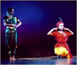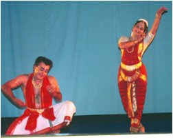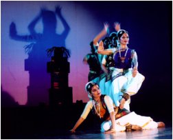 AADHUNIKA was presented as a duet feature by Kiran and Sandhya. A set of six numbers made up the entire feature. Nrityodbhavam - the origin of dance was the initial number where the traditional Alarippu had been restructured to intersperse verses from the Natya Shastra. The choreography was a result of interesting interpretations of the Alarippu bringing the number to a stunning climax. Following this was a presentation of the popular Devaranama - Krishna Nee Begane Baro - where the dancers used the same lines -Kiran, to express Vatsalya and Sandhya to express Sringara. The central number was Shivarpanam - A piece on Lord Shiva. The piece was identified for its imaginative choreography and effective visualization, and was a classic attempt at dramatic and narrative interpretation. Following this was a novel way of interpreting the evergreen Devaranama Jagadodharana of Purandaradasa. Yashoda is in constant conflict about her son - Is he a mere mortal or is he the great Lord himself? Should she punish him for his pranks or should she revere him for his greatness? In this piece the traditional method of interpreting the Padartha is done away with. Instead it is depicted as a conversation between Yashoda and Krishna, one night. Kiran then performed his solo number-a heart rending Meera bhajan - Sharanagati. The presentation itself of this number was very different because of the use of a prop - a gigantic painting of a peacock feather and flute-that signified Krishna. The appearance and disappearance of the prop signified Krishna's benevolence and compassion that graces our lives. The recital concluded with a stunning climax - Natavara Sri Krishna - An adaptation of the traditional Thillana. The dancers wove a fantasy involving a lovelorn Nayika fantasising about her lord Krishna, giving the entire sequence a dream like quality. AARAMBH was presented by The Rasika Dance Ensemble - the performing unit of The Kirans' institution Rasika. The recital opened with a dramatic number of the same name which puts all aspects of Bharathanatyam in a nutshell. The dancers described in vivid patterns the techniques that make Bharathanatyam one of the most comprehensive styles of today. The different varieties of body movements were presented in visually delightful manners culminating in the emotional aspect of dance-the Navarasas. All aspects of Bharathanatyam - Angika, Vacika, Aharya and Satvika, were exploited in this number. Often dancers have wondered if it is possible to present a traditional Pada Varnam with group choreography. Also the introduction of theermanams in between, most certainly causes Rasa Bhangam - a break in the emotional build up of the Varnam. The Varnam presented here - Poorvikalyani - Swamiyai vara sholladi - was a welcome change in these two aspects. For one, the introduction of all the Ashtanayikas, in keeping with the lyrics of the piece changed the interpretation of the Varnam dramatically. Thus a group was effectively introduced in the Varnam format. Secondly, the Theermanams executed expressed the mood of the lines thus enhancing the emotion of the piece. Further the popular Surdas Bhajan - Maiyya Mori - was presented in the Natya format. It was a delightful presentation of the piece. AARAMBH ended with two pieces - one, an energetic, vibrant number on Shiva and the last, a visual interpretation of the Thani Avarthanam. AADHUNIKA and