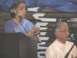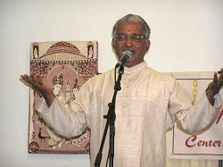 In his opening remarks he said Bharatanaatyam is a living art tracing it’s antiquity to thousands of years back and how it withstood the test of time. This art has grown beyond time and space and its richness cannot be matched with any mere physical technique being presented as modern or contemporary. Dhananjayan’s explicit demonstration and explanation convinced the audience that in the name of modernity we are tracing back to our primitive physical activities both in body movements and attires. Bharatanaatyam is the most civilized and sophisticated performing art with vast scope for innovations according to time and situations. He very liberally quoted from the Naatyasaastra, the freedom of expression within the discipline of a fathomless technique developed by our sages and further contributions from great Gurus of each generation. Answering a question from the audience for abstract expressions without emotions, instant demonstration of the body language through which he communicated the ideas, drew instantaneous applause. Further he asked the camp participants to come out with their own gestures for abstract objects and proved to the audience the periodical innovations in the technique contributed by various artists were assimilated into the main stream. He said there is nothing that cannot be communicated by the deep rooted technique in the various performing art forms of Bharata and changes have taken place keeping the aesthetic beauty and Indian ethos intact. He made the uninitiated members of the audience to feel one with the art and how easy it is to understand and appreciate classical Dance forms. Joining the discussion, Shanta Dhananjayan answered some of the parents’ questions and said learning art gives a child a sense of cultural affinity and mental discipline, which will reflect in any profession he or she chooses. She further added that, at least they would be better human beings. Explaining and demonstrating the points, Dhananjayan said Nritta - the pure abstract dance of rhythm, cleanse the body, Nritya – the expression of communication educate the mind, and Naatya – the spiritual enlightenment through enacting stories of moral values, and demonstrated these aspects with the help of some of the participants in the Naatya adhyayana camp organized by Nrityollaasa. Climax of the evening lecture demonstration brought down the house when a little 5 year old girl walked up to the dais and narrated the story of a deer enacted by Dhananjayan in the classical idiom. The communication was instantaneous with the technique employed in the classical dance and this proved beyond any doubt that Bharatanaatyam is so very easy to understand even to a little child and can elevate one to a higher plane of spirituality. If properly performed by the artiste it can touch the heart. During the course of the lec-dem, Dhananjayan mentioned that, if each family had invited and brought at least one American neighbor or friend for this lecture demonstration, the community could have justified their contribution of popularizing the value and richness of Indian art and culture and not confining it to themselves. (Food for thought) In the concluding remarks Prof. Subramaniam, a visiting grand old man from India, said any classical art discipline (music or dance) is good for growing children to sharpen their intelligence and increase power of concentration. The best medicine for tension or stress release is to listen to classical music or to watch Bharatanaatyam, which provide both listening and visual pleasure. He said people here wasted a lot of money on stress release medicines and artificial exercises, instead they can get rich rewards from classical music and dance for less spending. He congratulated Roopa Shyamsundar and thanked her for the community service she is doing by organizing such events and also imparting training in Bharatanaatyam to young children in this area. Sudha Chandrasekhar, a well known Bharatanaatyam artiste and pioneer in the US, felicitated the Dhananjayans and said they have been great inspirations to very many artistes like her. |