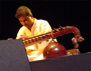This reviewer had to depend almost entirely on his eyes and ears as he has little or no knowledge of western classical music and a nodding acquaintance with Carnatic music. As Eero mentioned later during the interaction with the audience, the gottuvadhyam is very different from the western string instruments and with the visible gliding over from note to note creates a special tonal ambience. Allam Sri Durga Prasad wielded the instrument with absolute grace and poise, and at times underplayed when Roi Ruottinen (cello) and Minna Pensola (violin) painted variational contra patterns. The rhythm to hang on to was provided by R Ramesh on the mridangam. It was interesting to see the western musicians count Misrachapu with their hands as Ramesh played a few avartanams solo. The second variation was particularly interesting as all the other instruments intercepted and punctuated the main playing by Eero on the harmonium. The gottu vadhyam took over the rhythmic role in the fourth variation and maintained a linear rhythm as Roi and Minna played on. The fifth one had them playing variations that closely resembled the technique of sangati singing in Carnatic music. One could see