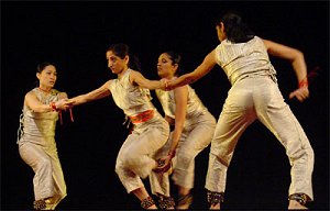 As this reviewer had just finished reading Maxine Hong Kingston’s path breaking work, The Woman Warrior, he was rewarded with a beautiful experience where the image of the warrior developed on the stage juxtaposed with that in the text. This is the peculiar strength of contemporary dance. Promising no closure of meanings, it permits you to freely draw from other experiences and synergize them to create a new one for yourself. The retelling of A K Ramanujan’s “The Wall” was poignantly done using a diaphanous blue cloth that acted both as a saree and as apparently weak (yet strong enough to weigh her down) patriarchal control. Interestingly, because of the way it was handled by Parijat, the widowed woman’s resorting to tell her story to the wall did not evoke pity as much as admiration for her conviction to speak at all. The interactive session at the end of the performance digressed into a discussion of the semantic limitations of terms like “fusion,” ”modern,” and “contemporary.” One wondered how sensible it is to weigh the relative merits of terms that have different frames of reference. While “fusion” refers to the nature of a work, “modern” and “contemporary” have temporal resonances. And the mindless use of the word “fusion” has eroded it of any positive sense at all and it has come to refer to a “mixture of things” as one member of the audience put it. However, just as the term suggests, fusion stands for a harmonious coming together of styles – a process at the end of which it is almost impossible to pick out the individual influences like distiches from a bad poem. In Parijat