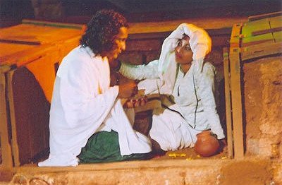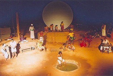 Meanwhile the village succumbs to a pestilence, smallpox. Ravi gets cured while many die. He becomes an insider by now. In the course of five years, the land with its sensuality sucks him like a quagmire. Finally, he is liberated when bitten by a snake. The drama is a reminder of how we have lost our roots and our feel for our environment aglow with legends. The Indian philosophy of life as the consequences of our action and reaction is built into human life in its simplicity and subtlety. A life of contradictions where two rival religious groups, the Hindus and Muslims co-exist has an ironic tinge. The stage setting and animation help in introducing some postmodern features. The costume endows an old-world charm. The manipulation of gibberish is a classic stroke. Its experimental