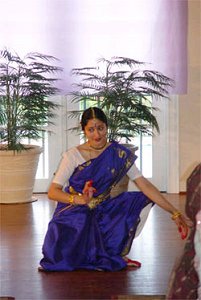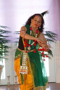 The MC for the program was Shobha Subramaniam, who rendered an invocation in her melodious voice. This was followed by "Dasavatar" presented by Christel Stevens in Manipuri style. The program continued with solo presentations of various Ashtapadis depicting Radha in a range of moods in several styles of dance. Janaki Rangarajan presented the third and the twelfth ashtapadis in Bharatanrityam style, depicting the spring season and longing of Radha. Vani Ramesh then presented the fourth ashtapadi in Bharatanatyam, describing Radha full of despair as she trembles and laments her beloved's absence. This was followed by a Kuchipudi presentation by Lakshmi Babu depicting two engaging springs of human life –Srinagara and Viraha. Bagni Das then