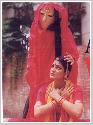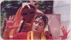 One of the interesting aspects of this production was the interweaving of the dancers and the puppets and puppeteers. The puppets are visualized as the alter egos of the protagonist. There were different kinds of puppets - stylized as well as figurative puppets, puppet-puppets and human puppets, the dancing puppets as well as static puppets. In fact, the puppetry and the dancing were not well balanced. The puppets tended to overshadow the dancers most of the time. Some more of dance may have energized the production. However, the puppets by themselves instilled new dimensions in this production. The most remarkable puppet was the big white one made of sponge - just a face and two hands - which remained as an installation in the background and moved in wherever needed. The movement of this puppet was especially good. The human puppets were very effective, but their movements were clumsy and could have been choreographed better. The puppet, which disappointed me, was the main "Draupadi" puppet. Its movements were clumsy and manipulated in an obvious manner. The music was good and created a good ambience for the production. The lighting was good. The other aspect of the production which somewhat negated the whole production was the wordiness of the script. Everything that had to be said was said in the script. The emotions were all conveyed through the voice of the narrator. So, there was very little left for the dancers to communicate. The wordiness of the script tended to give a propagandist, agit-prop touch to the entire production. A fragmented and more suggestive script and a little less literal interpretation by the dancers would have enhanced the production. But, as the producers themselves are treating this as an ongoing and changing piece, Her voice would evolve in a better form soon. As all experiments,