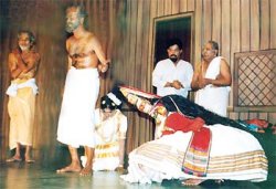 | “So long as I am alive, I cannot accept Kathakali as just a play without its soul; I shall show you what Kathakali is”. With these words of authority, Kesava Panicker asan went into action and fell dead in front of the deserving witnesses – his son Kuttan who has been trying to sell Kathakali and Mohiniyattom to the non-Indian tourist. Among the witnesses were, Panicker’s right hand man Sankaran Nair, daughter Karthu and the Chenda artist Kuttappa Marar. This--------- the last scene of the Malayalam play ‘Cholliyattom’ ends with the announcement that Panicker has been posthumously awarded ‘Natyavibhooshan’ for his inimitable contributions to Kathakali. | ![]() |