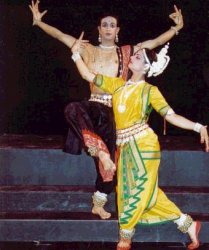 On Friday evening the concert opened with a lamp-lighting ceremony by the honorary patrons, Ambassador of India Lalit Mansingh and his wife, Mrs. Indira Mansingh. The curtain opened to reveal two dancers draped in translucent white veils, which covered their faces but revealed their slow, statuesque gestures. The veils were swept off into the wings to reveal the husband-and-wife team from Bangalore, India, Nirupama and Rajendra. This attractive pair performed “Nigah,” an innovative composition based on Kathak, a glamorous court dance from Northern India, accompanied by an original combination of flamenco guitar and Indian tabla drums. Kathak dance is ruled by rhythm, since the dancers wear heavy bells and use them in perfect synchrony with the tablas, but Nirupama and Rajendra made the rhythmic fireworks take a backseat to their light, feathery runs and spins. Unusual as it is to see Indian dancers up on their toes, these two have made it a trademark, alternating airy flight with grounded poses, all performed with a charming attention to one another that brought audible sighs of pleasure from the audience. When Nirupama took center stage, Rajendra seemed to be pulled towards her as a bee to a flower, spiraling ever nearer. Together, they adopted several typically Spanish poses while emphasizing Indian footwork, clearly referring to the historical contribution made by gypsies of Indian origin to the flamenco style. From this promising start, the festival continued late into the night, and for two days thereafter, in an ambitious attempt to include as many different dancers and techniques as possible. Abha Roy and Anup Das of New York headed a cast of local Washington area Kathak dancers in a very traditional production of “Meghdut,” directed bu Asha Vattikuti. On Saturday’s matinee, four D.C.-area Kuchipudi dancers presented a sparkling “Krishna Parijatam,” with the lovely Lakshmi Babu giving a fiery appearance as Satyabhama. On Saturday evening, a Contemporary Showcase featured Bipasha Guptaroy’s very artistic homage to Uday Shankar. Her delicacy made the modern technique seem as fresh as tomorrow, though the year 2000 marked the great innovator’s centenary. Raka Maitra performed a very subtle peacock dance in Seraikella Chhau style, then joined with Sukanya Mukherjee in a performance of “The Path,” an imaginative production which gave the audience a taste of India’s village life at it chronicled a day in the life of a footpath. Indian musicians